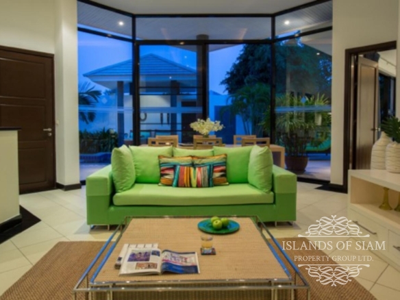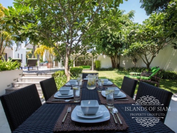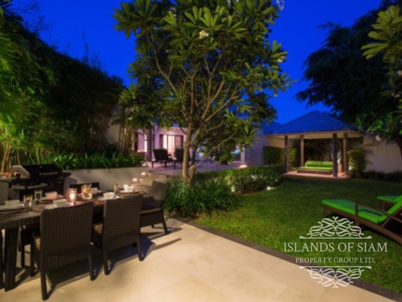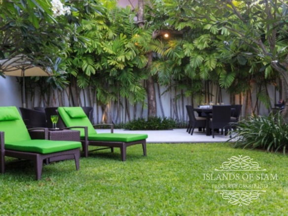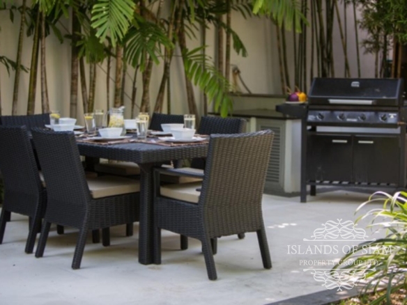 Tongsai Grove is a very private villa, within easy walking distance of the beautiful Cheong Mon beach and village, making it ideal for families who want to be close to all amenities. This beautifully decorated villa has everything you need for a self-catering holiday, consisting of air conditioned bedrooms, all with ensuite bathrooms with showers. The open plan living area has slide back floor to ceiling patio doors at both the front and back of the room allowing soft breezes to filtrate through complimented by ceiling fans and cool tiled flooring. The living room consists of comfortable sofas and a plasma TV with satellite channels, music centre and internet access for your entertainment. There is also a dining table seating 6 persons next to a fully equipped kitchen. A utility room joins this, with its own washing machine, where you can take care of any additional laundry needs. A door leads off the living area to the master bedroom with ensuite and the remaining 2 bedrooms with own bathrooms can be accessed via the pool terrace. Outside, this villa boasts a very large garden indeed, rattan loungers can be found around the pool area, with its own mini sala to help cool you down. Step down into the garden area where you will find another dining area with BBQ and outdoor fridge, and beautiful lawn area and a second sala if you feel the need to escape completely. The villa has its own power back-up generator which is automatic and silent should the need arise. This villa can provide a continental breakfast each day if required.