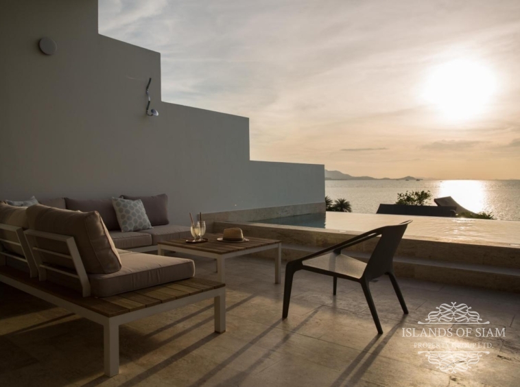 A luxury 180 sqm penthouse suite with a separate Cinema, two generous ensuite bedrooms, a separate lounge and dining area with fitted kitchen – complemented by a large deck with loungers, sofa beds and a 25 sqm infinity pool with 180 degree panoramic views across the glittering Bay of Thailand – provides ample space for four people.