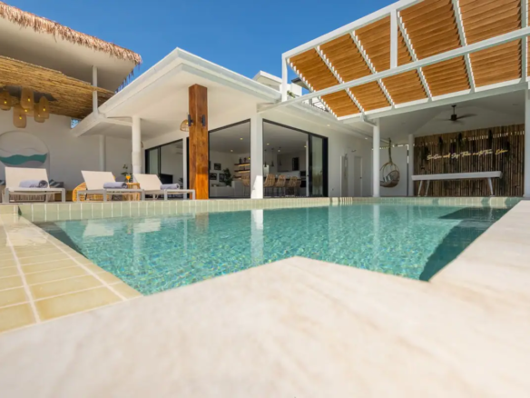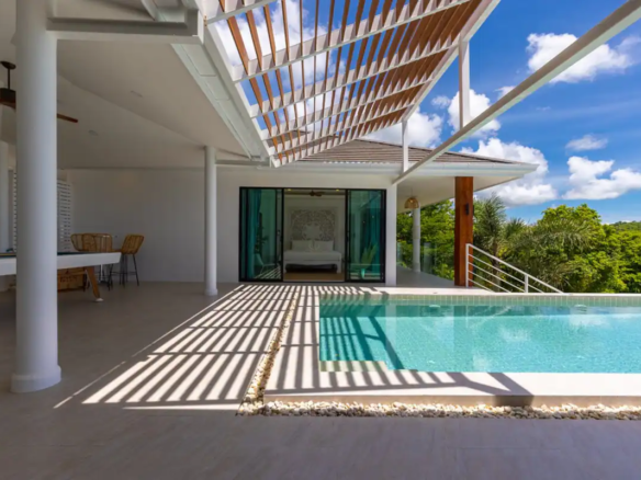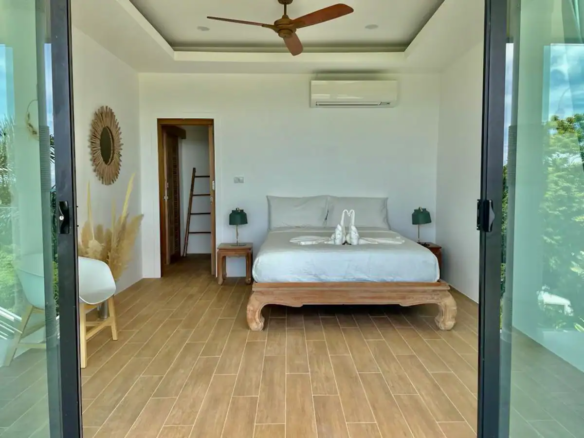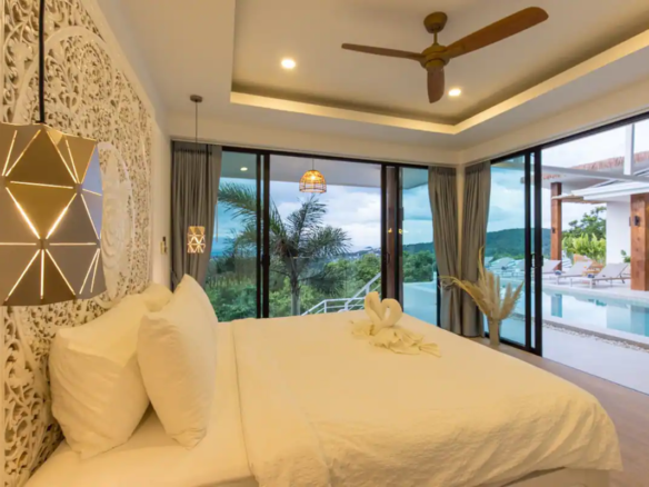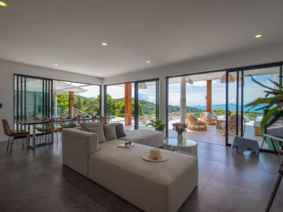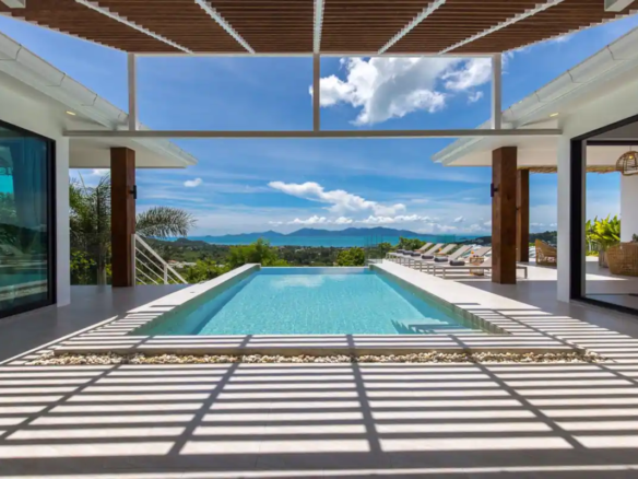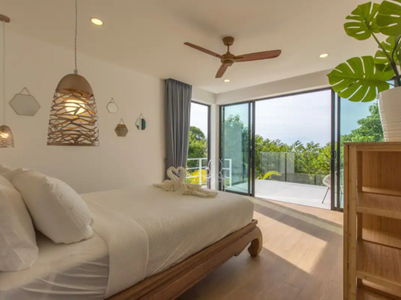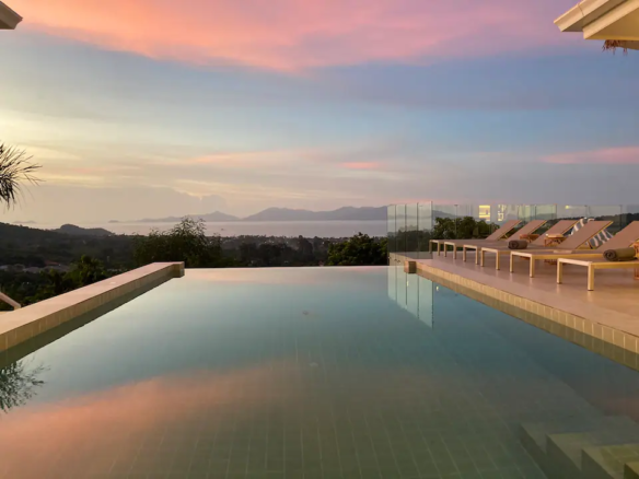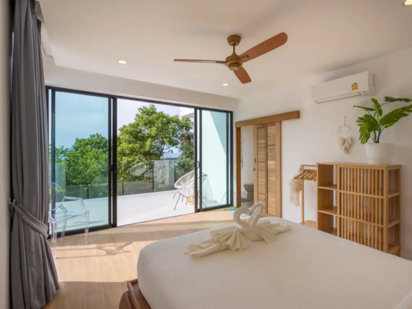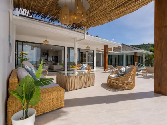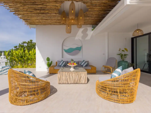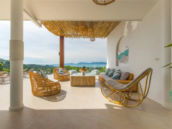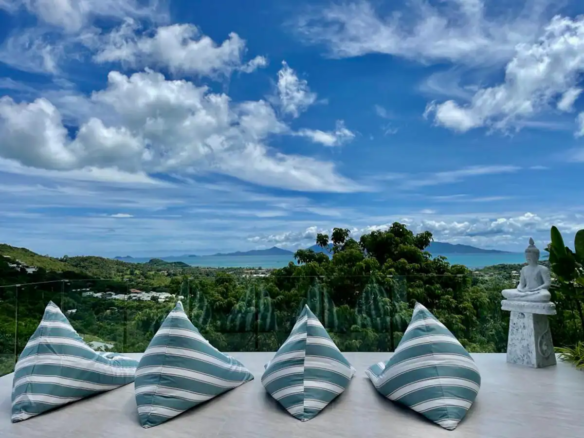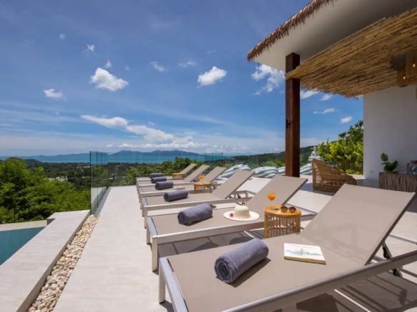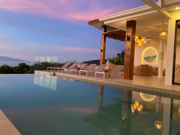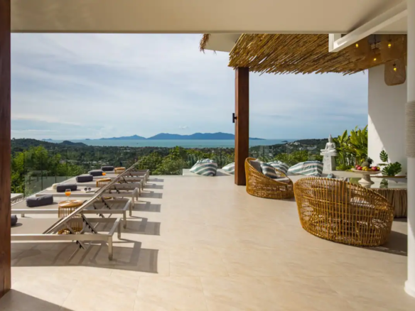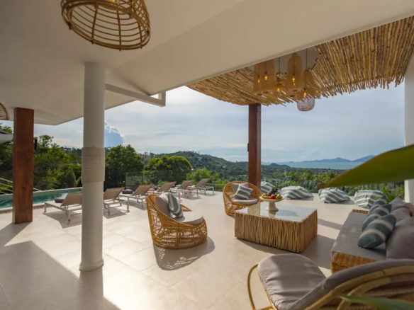 Beautiful 300 m2 new and fully equipped 4 bedroom villa, with tropical and chic decor, offering exceptional sea views with stunning 180° views of the nearby island of Koh Phangan and 5 mins from Fisherman Village and the beach.