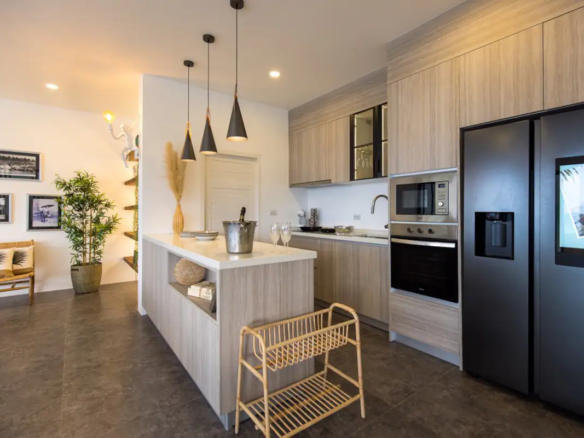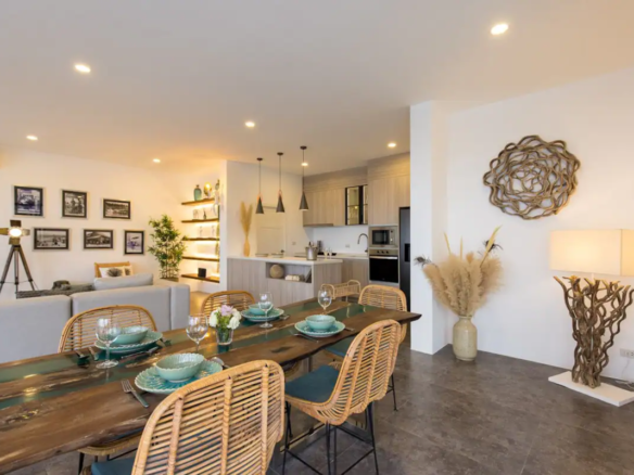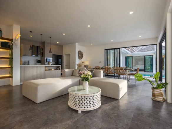 In a refined and uncluttered setting, discover the charms of Koh Samui and Thailand in this villa with multiple spaces for family vacations or with friends:a sleeping area with cocooning bedrooms with independent bathrooms and terraces, a living and relaxation area with its living room and fully equipped kitchen, laundry area, 2 terraces with an outdoor seating area, billiards area, and a bar area with hanging chair, and finally 1 independent bedroom with its private terrace, accessible from inside and outside the house.