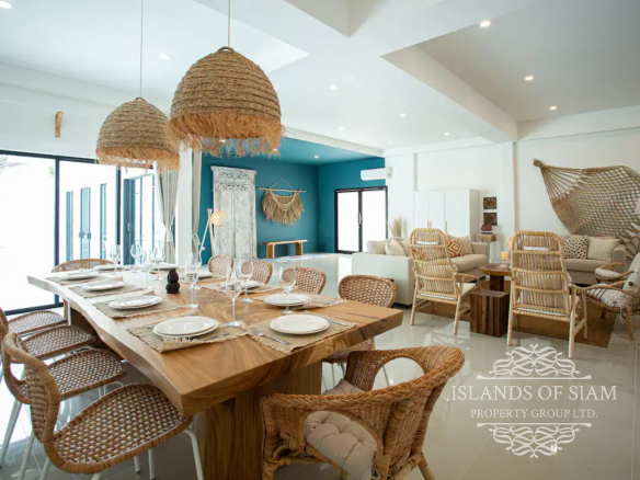 A large spacious living room of 90 m² where guests can watch movies, meditate or play board games. The kitchen is equipped with everything necessary for cooking and a large dining table for 10 people. The pool area also features a relaxation area and a dining table for outdoor dining.