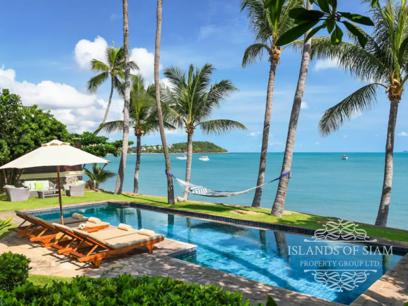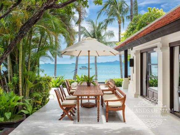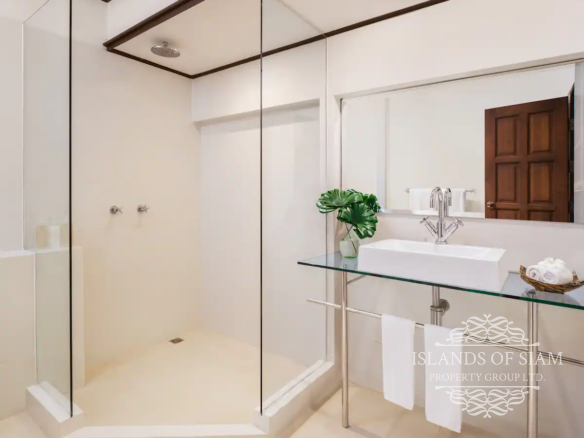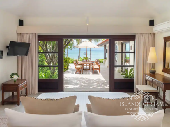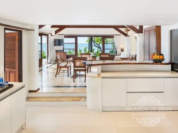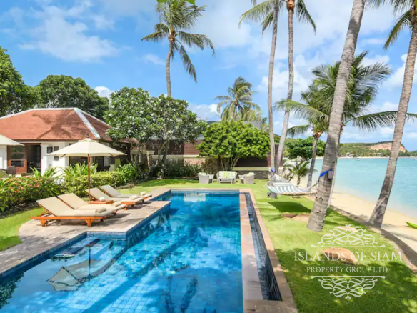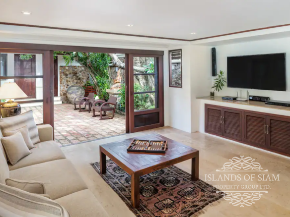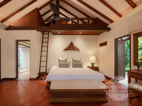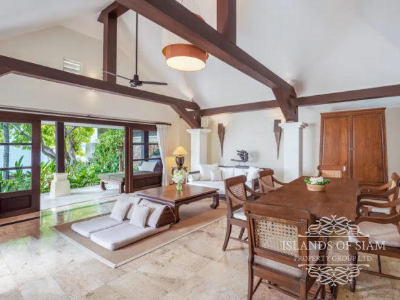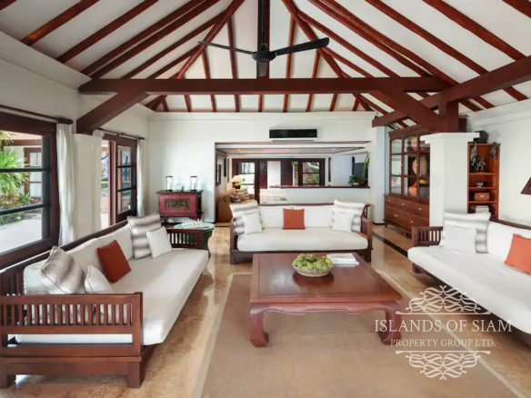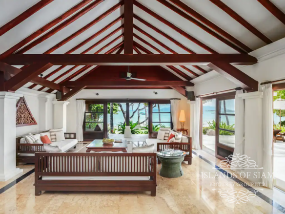 This Villa with 7 bedrooms has two pavilions, each with 330 square metres of living space and terrace and courtyard area, are located next to each other overlooking a beautiful white sandy beach with Koh Phanghan in the distance. There is a large living room with all amenities including satellite TV and a music system. Sliding doors from all living areas and master bedrooms open onto large teak decks, ideal for dining or just relaxing with a good book.