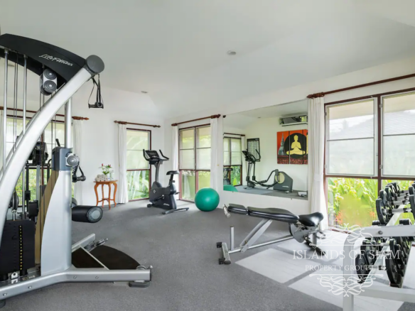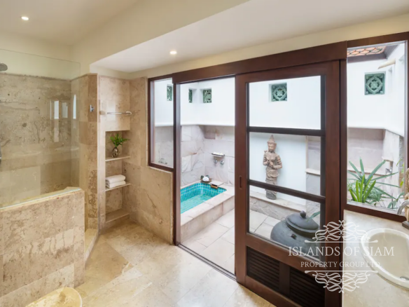 Each pavilion has 3 air-conditioned bedrooms (2 doubles and 1 twin), all with en-suite bathrooms. The master bedrooms overlook the beach and have luxurious bathrooms with a secluded outdoor Balinese bath and shower. All rooms are furnished and finished to a very high standard. There is a third building near the entrance of the property which has the gym, the seventh bedroom and a bathroom with a bath as well as a shower.