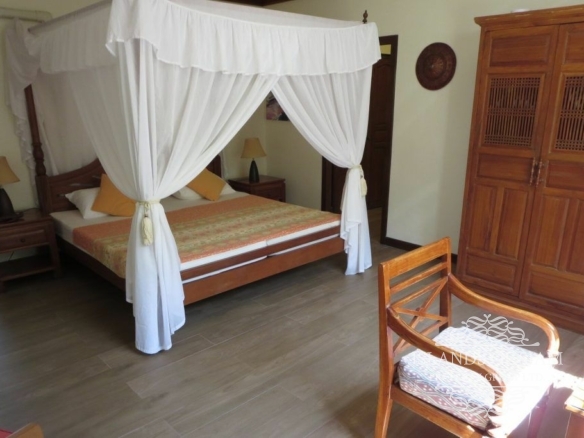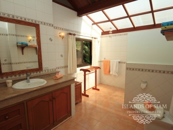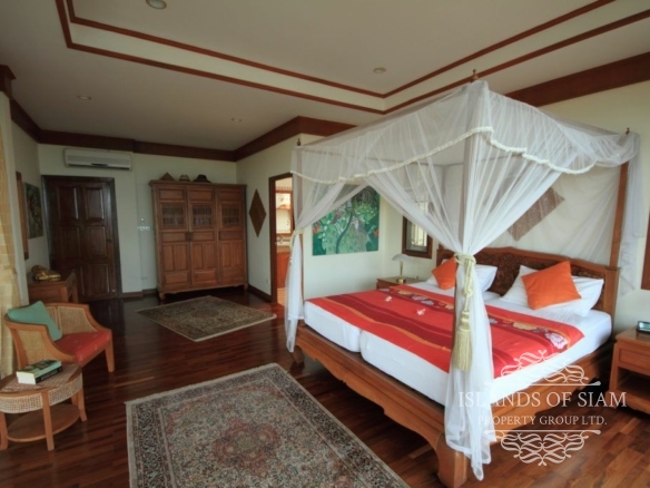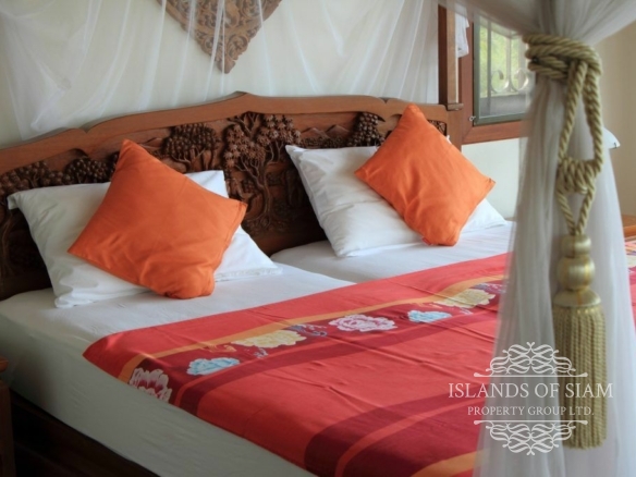 Your holiday home offers four attractively furnished double rooms, each with a double bed, and four bathrooms. Two of the bedrooms each have east or west views and their own bathroom en suite, teak floors and exit to the large balcony that surrounds the house on three sides. The third bedroom, also with en-suite bathroom, faces south and looks out onto the garden through a large window. The fourth bedroom is on the ground floor, also has its own bathroom and an exit to the furnished terrace at garden level, also with sea views. All four bedrooms are exquisitely furnished with real teak furniture from northern Thailand, mosquito nets and air conditioning.