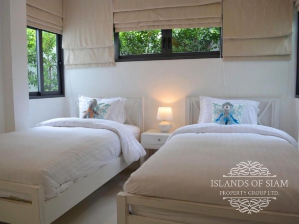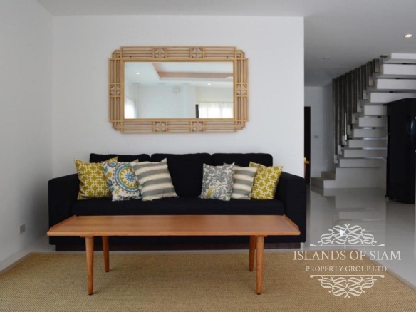 An amazing 2-storey semi-detached house which is located in a secured area in Plai Laem, Koh Samui. The villa features three bedrooms, one room is located on the main floor while the other two rooms are located on the second floor, fully equipped kitchen, dining, living area, and private pool. Privacy and security are a given in this established residential area, with private off-street parking for your comfort. The villa also features an outdoor living area with a bar counter. Going out to the villa you will find local restaurants around the area and grocery shops.