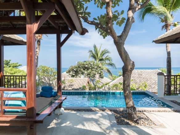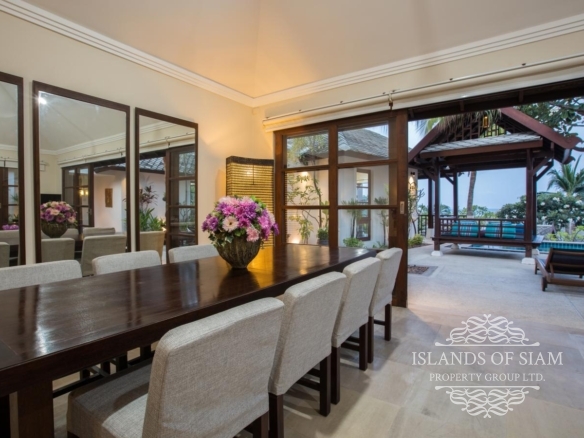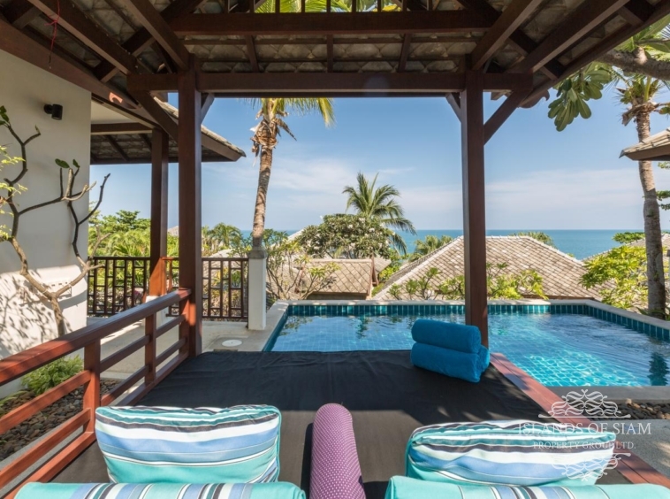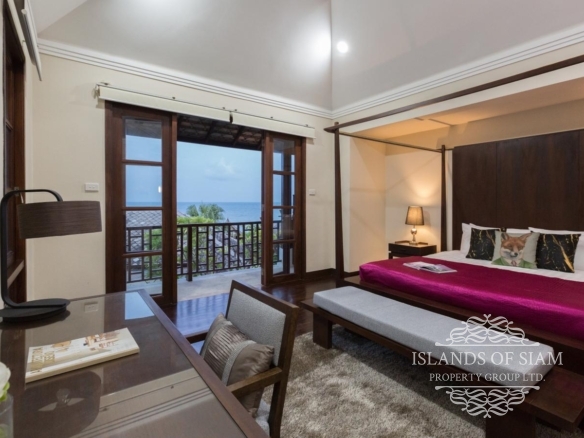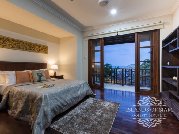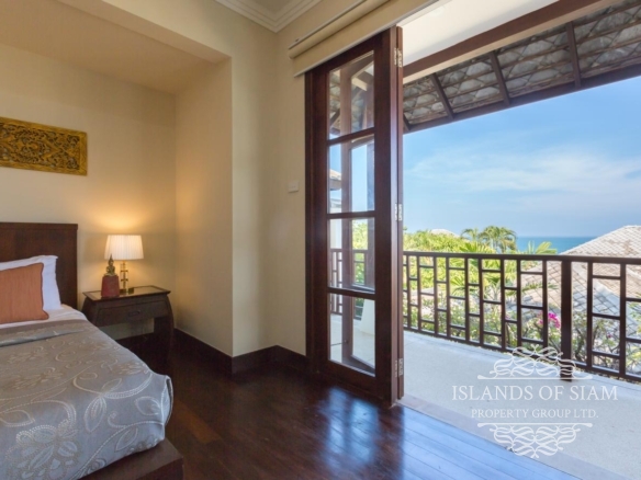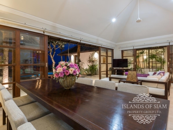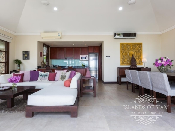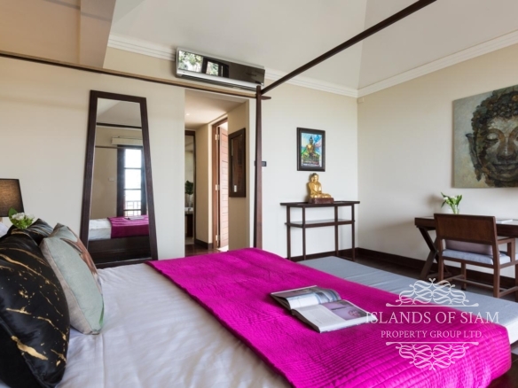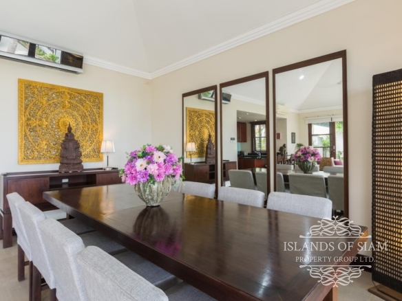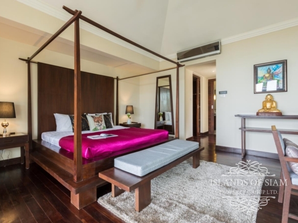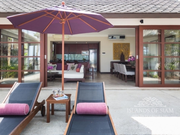 Entering the villa the first thing you notice is the beautiful sea view over the private swimming pool, with comfortable sun loungers and a traditional Thai style sala next to the pool, the perfect place to enjoy the view with a cold drink or even get an in villa massage done. The large open plan, air conditioned living room, kitchen and dining area is spacious and comfortable. With wide opening doors to let the breeze in while enjoying your meal prepared in the western style kitchen. Comfortable sofas are ideal for relaxing and watching a movie.