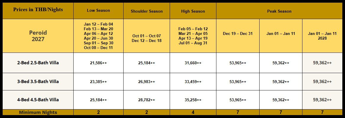 Chef or in-villa shopping service available at THB 300 or 20% of grocery cost as handling fee, whichever is greater and subject to 7% VAT