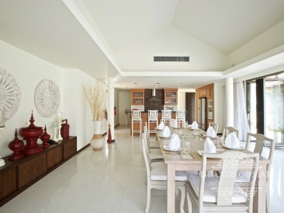 As one of the beachfront properties on the exclusive Dhevatara Residence located close to Koh Samui’s charming Fisherman’s Village, Baan Ban Buri offers a total of four bedrooms which can accommodate 8 guests for the perfect affordable luxury getaway. Spread across six separate pavilions lined up on either side of a central path, the contemporary Thai villa offers four well-appointed guest rooms dressed in white wooden beds, ornate cabinets and eclectic artworks, large en-suite bathrooms, a large open-plan dining, lounge and modern kitchen area. Floor-to-ceiling glass door panels make the most of the villa’s immediate views, whilst the wide beachfront terrace promises many outdoor hours soaking up the sun.