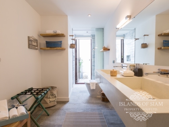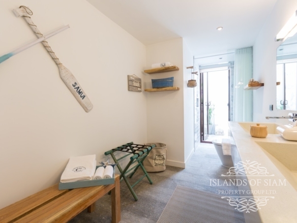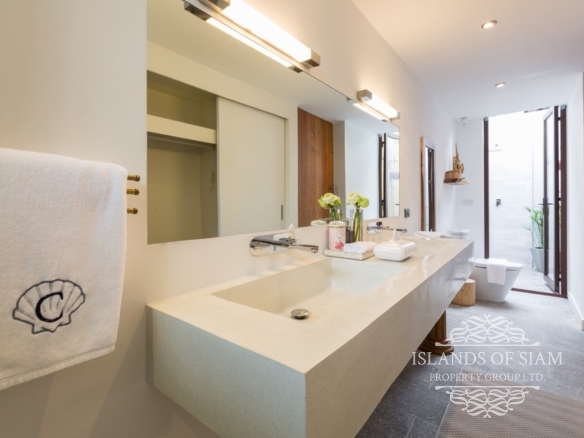 Baan Capo offers comfortable accommodation in its four spacious bedrooms each is 36 SQM. The two master suites open up to pool deck and ocean to the front, and to the covered patio and dining area to the side. Master suites boast king-size beds, feature walls with interesting artwork, built-in headboards with reading lights, and TVs with DVD. As with the living room, ceilings are vaulted and can be cooled by either air-conditioning or plantation ceiling fans. One room is decorated in greys and neutral shades, and the other in hues of blue, meaning both rooms blend in perfectly with the beach and sea views. Their en-suite outside garden bathrooms come complete with stone bathtubs, outdoor rain showers, as well as indoor showers, double vanities and dressing rooms.