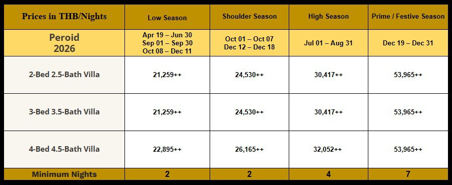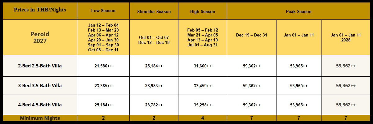 Chef or in-villa shopping service available at THB 300 or 20% of grocery cost as handling fee, whichever is greater and subject to 7% VAT
