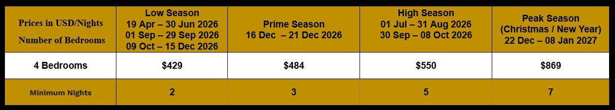 English speaking Villa Manager, Maids, Handyman, Private Chef on request (extra charge), Welcome Drink, Daily Breakfast, 1 x Round Trip Airport Transfers, WiFi throughout the villa