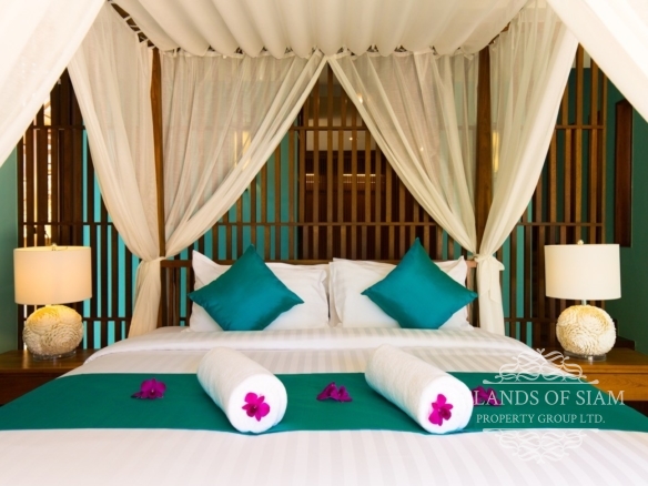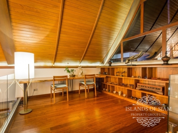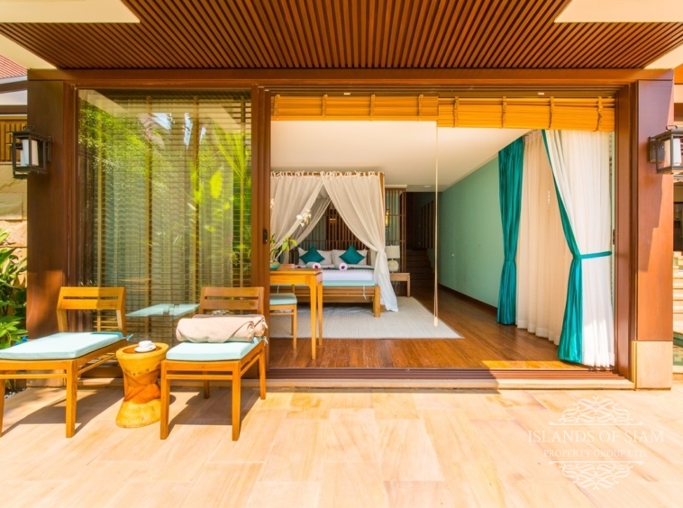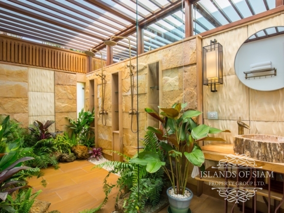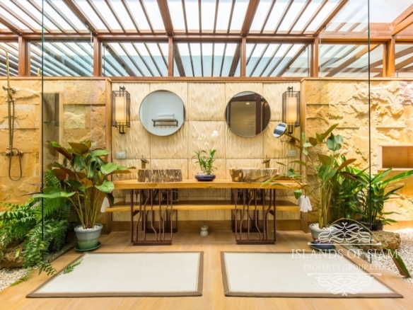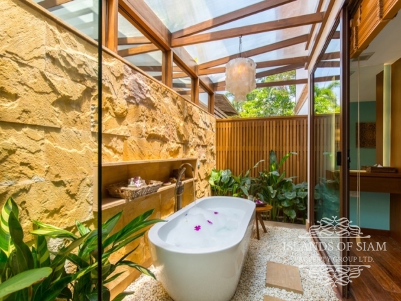 Moving through these first pavilions and past a second water feature, guests can enjoy poolside living at the 18.5-metre infinity pool which features waterfalls, a seated jacuzzi and numerous sunbeds. Besides the pool, guests can tuck themselves away into the living room sala, with its comfortable sitting and entertainment areas, where the floor-to-ceiling glass doors can be fully opened to the pool or closed when the outdoors is better kept outside. Down by the sea, a beach and a pool sala make for fabulous shaded relaxation with traditional Thai beds and dining areas perfect for cocktails, lazy lunches or seaside dinners.