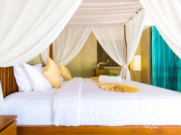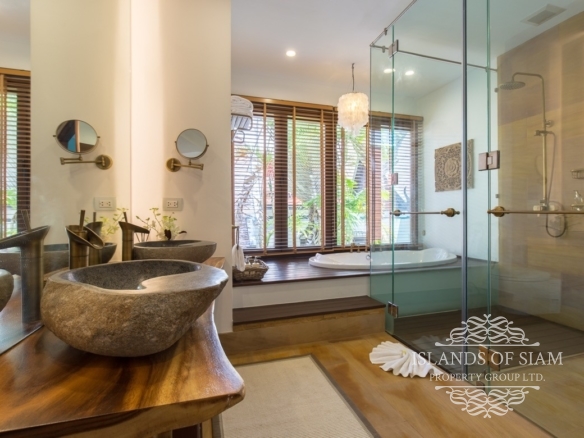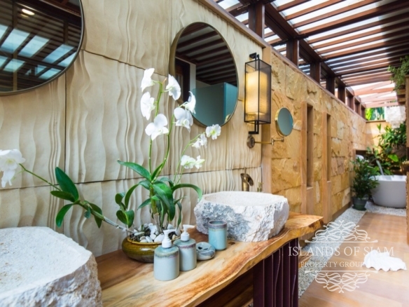 Surrounding this dining area, guests can choose from one of five ensuite bedrooms over two floors. Each spacious bedroom comes with king-size four-poster beds and has been exquisitely decorated with beautiful dark wood furnishings. All of the ensuite bathrooms are luxuriously finished with glass, wood and marble. Further blurring the lines of outdoor/indoor living, the master bedroom has an outdoor shower – perfect for enjoying tropical breezes and starry nights.