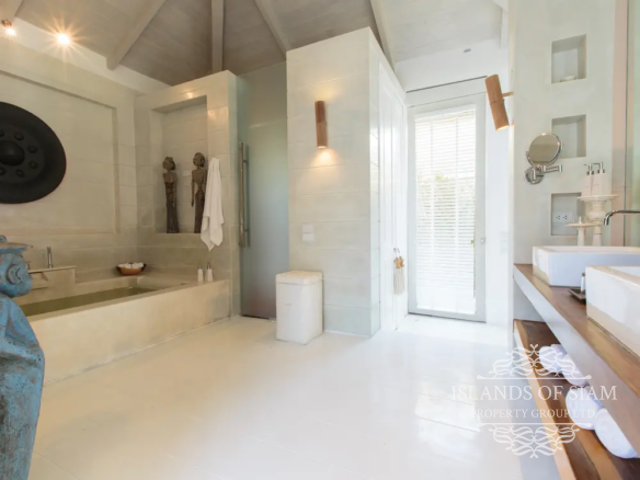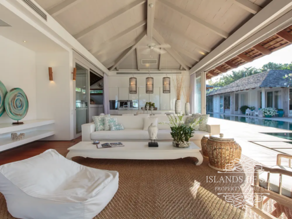 The palatial proportions of this villa include high vaulted wood-panelled beamed ceilings. The building is roofed with cedar shingles and all rooms have sliding glass walls that open to verandas on the pool deck. The high ceilings are painted white, giving all 6 bedrooms brightness and a clean, modern feel.
