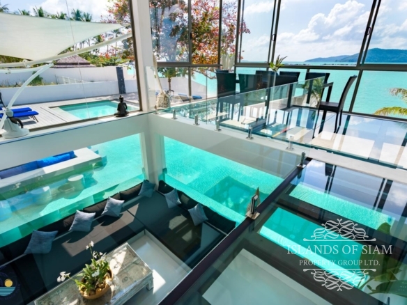 The unique and unmistakable “floating” living and dining pavilion which is partly submerged in the large pool and features an elevated glass-bottomed dining area is the main structure you see from the beach . A large spacious waterfront owner’s suite with a great view of the islands and an inviting 6 person jacuzzi, is one of 5 large bedrooms at the property . Another Pavillion bedroom is right behind the master bedroom Pavillion .