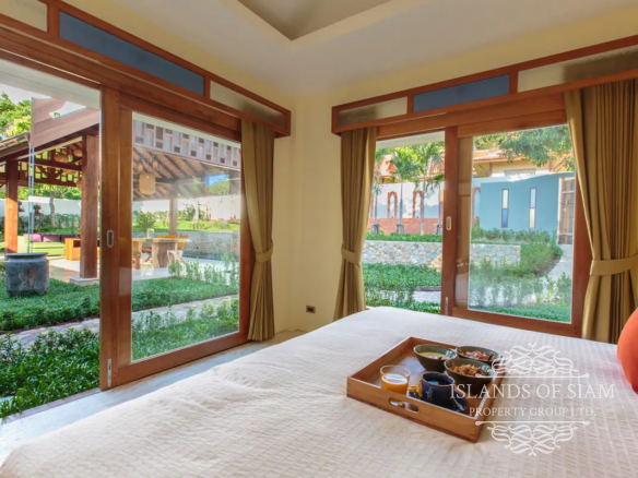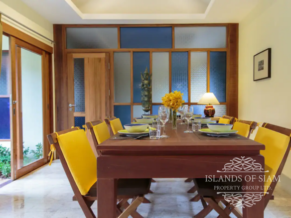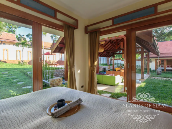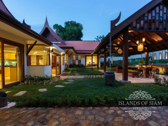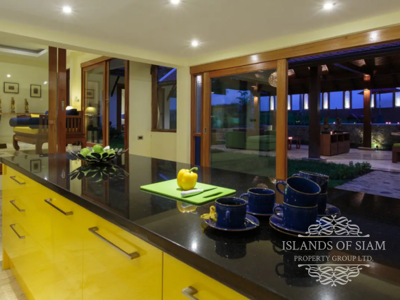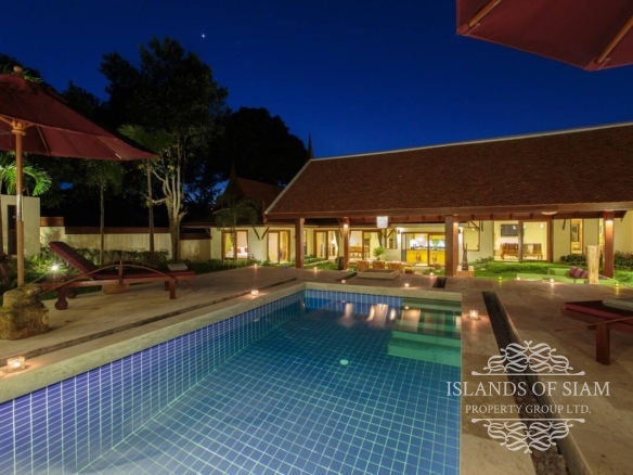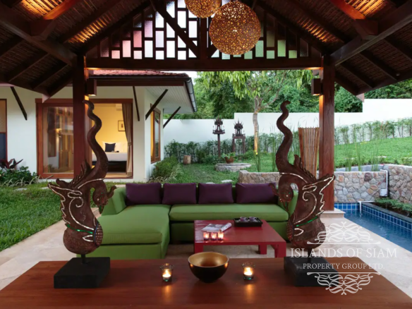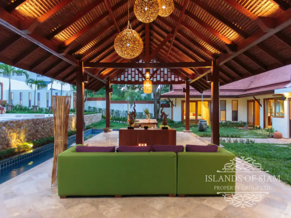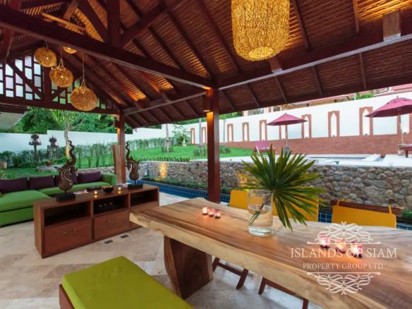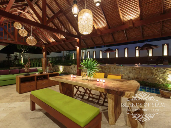 The location is wonderfully central to all activities, shops and beaches, but at the same time quiet on a cul-de-sac behind Bo Put Temple within walking distance of Bo Put Fisherman’s Village and beach. Unique to the villa is the gigantic “sala” (covered outdoor area) with dining table and lounge corner, the ultimate room for the tropics.
