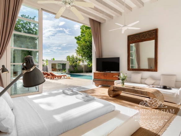 All three bedrooms in this villa are equally indulgent. Each boasts a King-size double bed, air-conditioning, LED TV and opulent en-suite bathrooms. The master bedroom suite, located adjacent to the living room, offers a spacious retreat with a sofa, coffee table, and desk. It features a high ceiling with suspended fans and opens onto the pool deck via sliding glass doors.