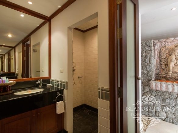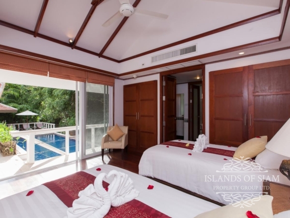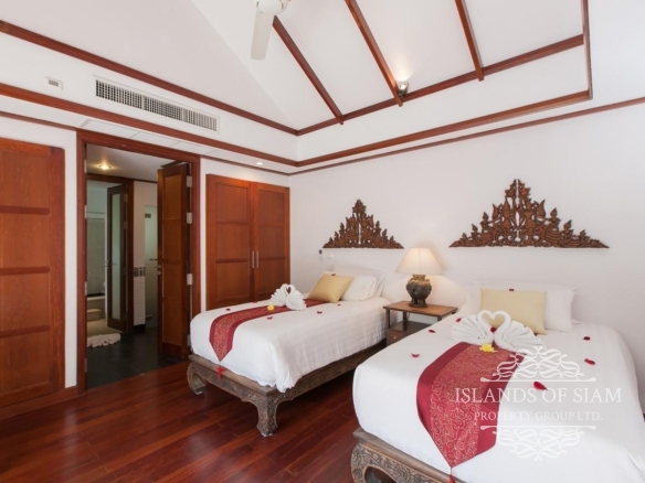 Canopied beds, large ensuite bathrooms and bathtubs ensure that you have a dreamy vacation. The twin room is great for kids or young adults. But it really is the villa’s outdoor areas that steal the spotlight. A long infinity pool stretches along the split-level terrace, with a glass barrier on one side, ensuring safety for kids. A covered sala on the terrace is great for an early morning yoga session or an outdoor massage, while the sun loungers nearby are handy if you wish to soak up the sun. The lovely blue-tiled 11-metre pool can be accessed via a short set of steps, and thanks to the mature vegetation you’ll have plenty of privacy, while two huge banyan trees at the front of the villa offering additional shade.