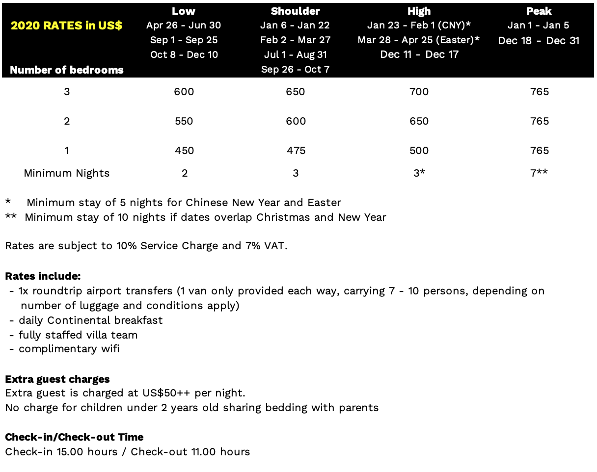 Chef or in-villa shopping service available at THB 300 or 20% of grocery cost as handling cost, or whichever is greater and subject to 7% VAT