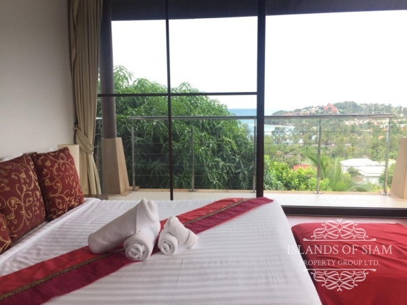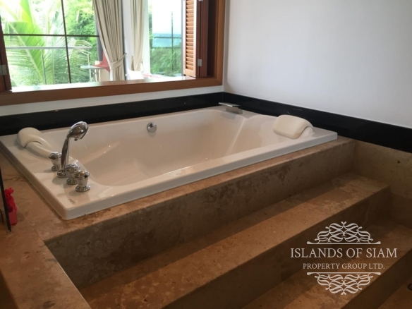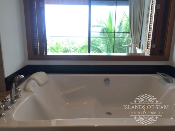 This luxurious 3 bedroom Balinese style villa has amazing views overlooking Choeng Mon Beach. A comfortable space that can accommodate up to 6 people.The main building has a fully equipped western kitchen, guest bathroom, dining area and living room. A large vaulted ceiling provides a feeling of space whilst a large flat screen TV with satellite tv connection and a quality music system provide the entertainment. All bedrooms are air conditioned and have en suite bathrooms. The master and 1 guest bedroom have sea views whilst all bedrooms have en-suite bathrooms. There are two Jacuzzis inside, one of which is large enough for two people. All rooms lead to the large terrace, where the waterfall gently cascades into the large clear infinity edged pool. This villa is equally suited to indoor and outdoor living.