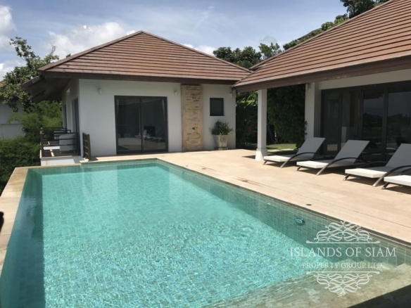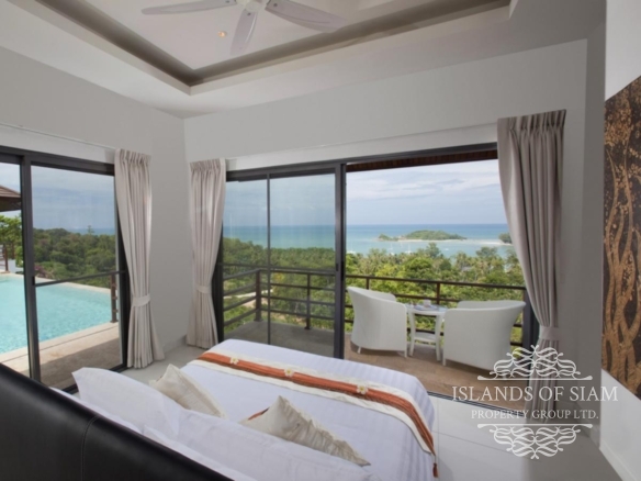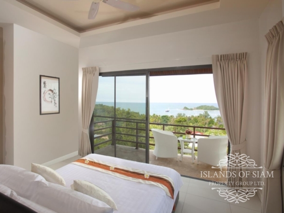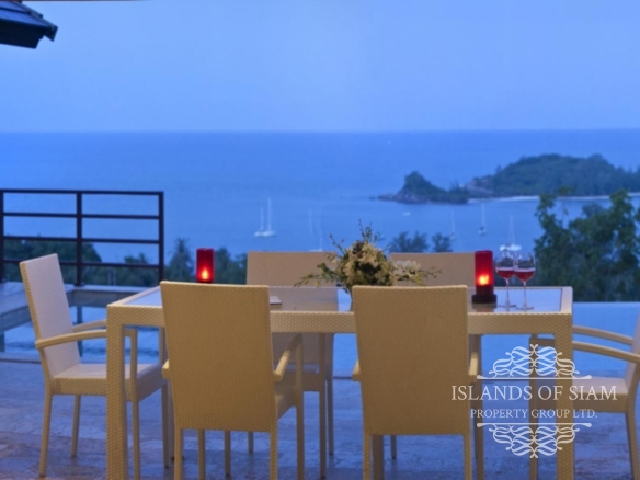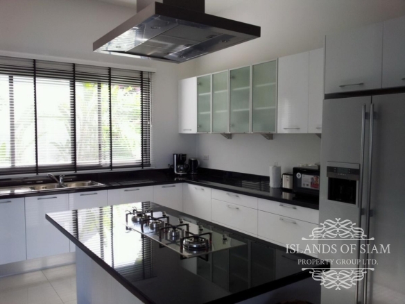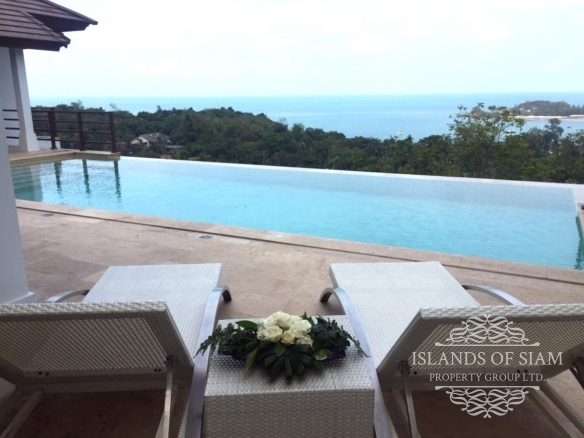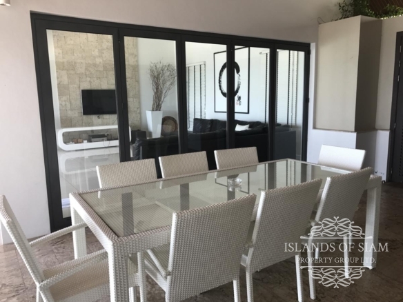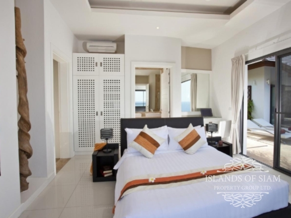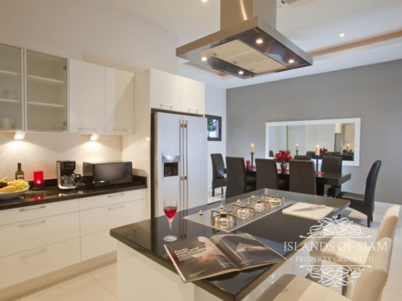 This villa makes ‘cool luxury’ come to life, with tasteful modern white and cream décor, chic colourful accessories and abstract wall art, and high floor-to-ceiling glass doors that open up the living areas to create a vast entertainment space. The villa has air conditioning throughout, plus Wi-Fi Internet access. On entering the villa, the first room you find is the amazing fully fitted kitchen, that has all the appliances you need, prepare an amazing meal on the island unit and serve at the spacious 8 seater dining table inside, or slide back the glass doors and serve straight outside at a second dining table on the terrace. Next a spacious living room awaits with leather sofas and large flat screen TV with many channels to choose from. Slide back the glass doors and inside meets outside, straight onto the pool terrace with the stunning views of Cheongmon beach, sun loungers await. Here you will also find a guest washroom, and the first 3 of the 4 bedrooms all containing double beds and ensuite bathrooms. A large master suite awaits to the left of the pool, and 2 guest bedrooms are on the right, all having the same magnificent views that you would see from the pool with their own private balconies. A fourth bedroom can be found on the next level down, another beautifully appointed suite that has its own staircase leading to it, ideal for those who like a little more privacy. A villa that truly has that wow factor.