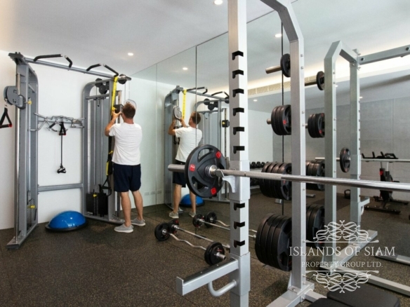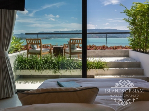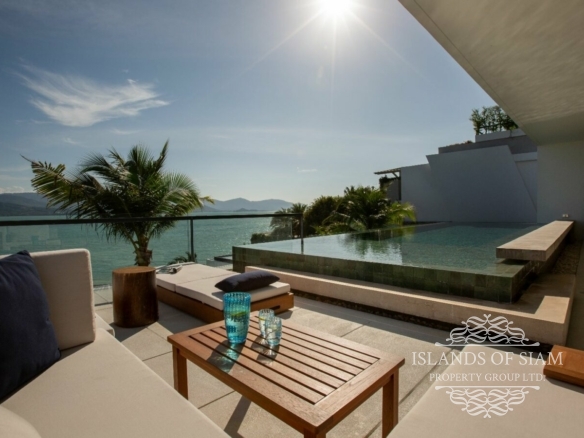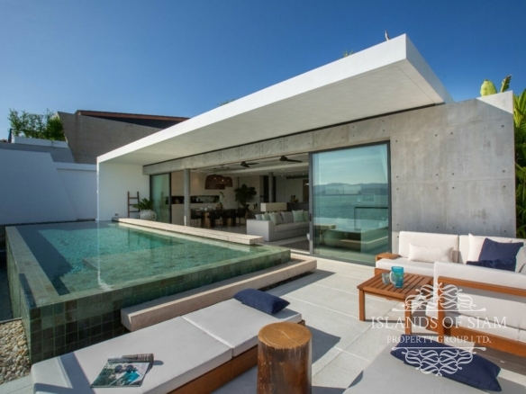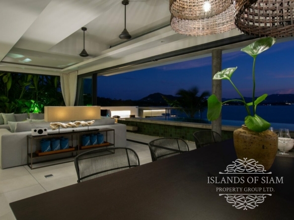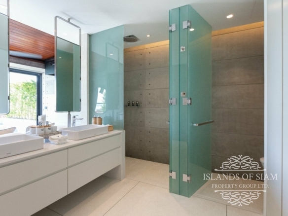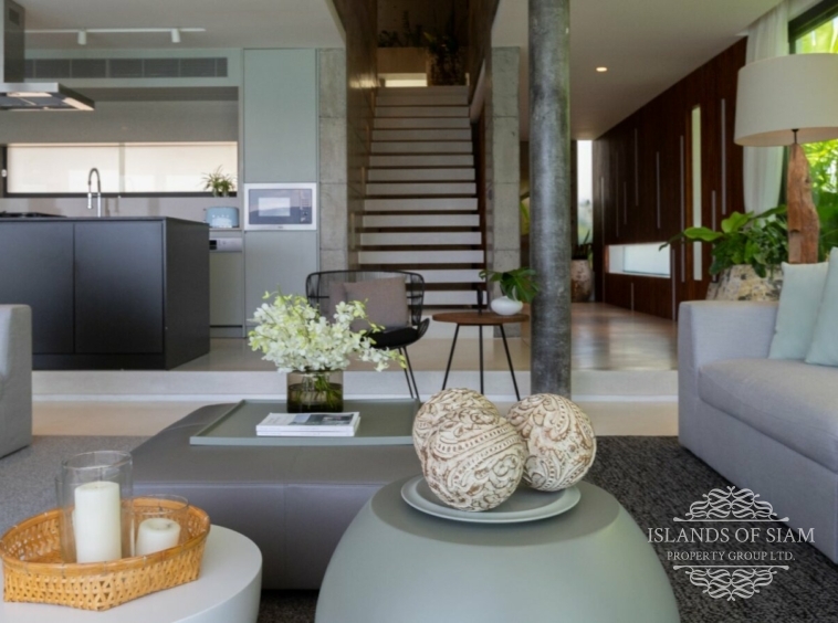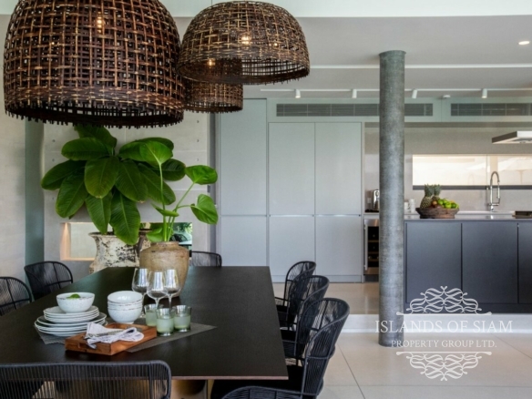 The fully-equipped luxury kitchen and dining room features imported European furnishings and appliances and accordion doors opening onto a large terrace with oak lounge furniture and an infinity swimming pool overlooking the sea with views of the famed Big Buddha to the south. Delicate sculptures and Bohemian-inspired art pieces accent the airy modern design.