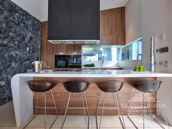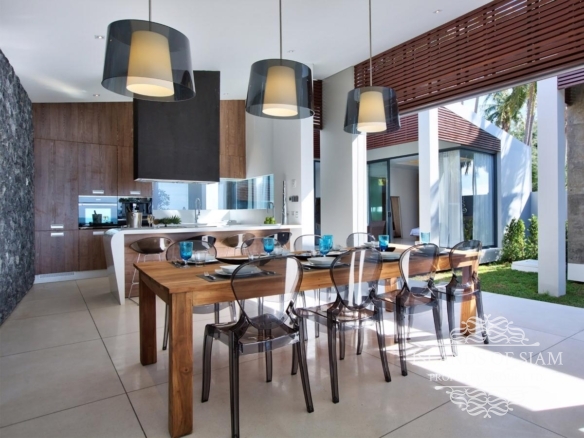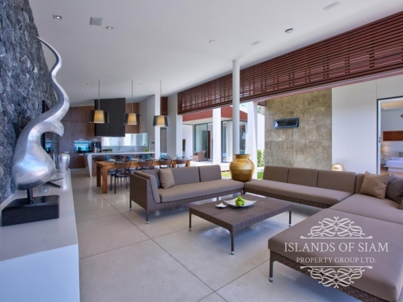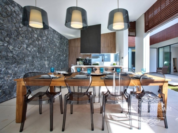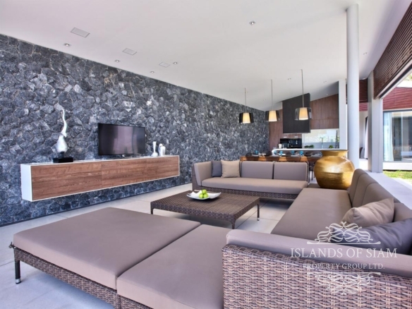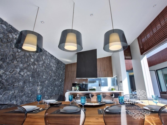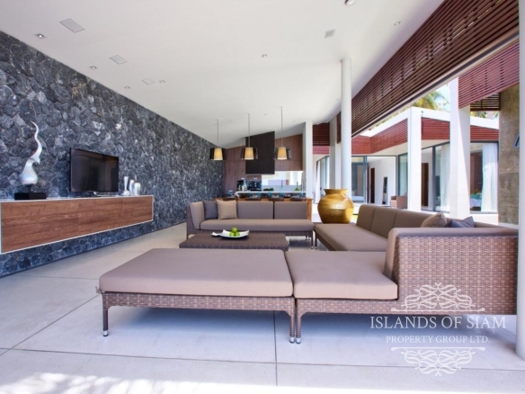 Contemporary in design and thoughtful in its layout, the villa features an open-sided living pavilion, furnished with a comfortable U-shaped sofa facing a flat-screen TV, and a dining table for up to eight guests. A fully-fitted, western-style kitchen and breakfast bar runs along the other end. The living area steps down onto a deck that hugs the swimming pool, dotted with casual seating and sun loungers.