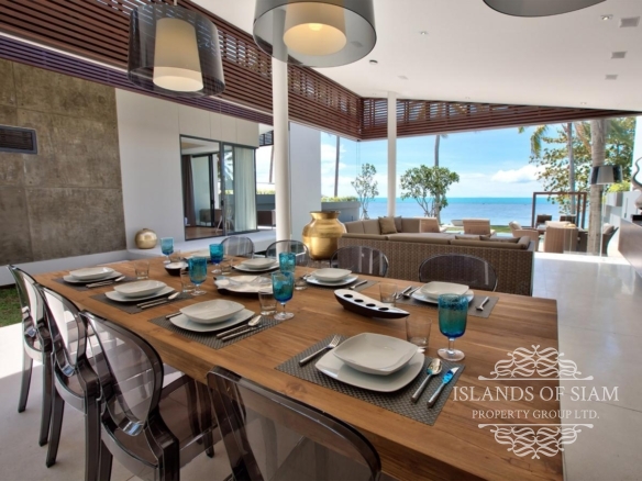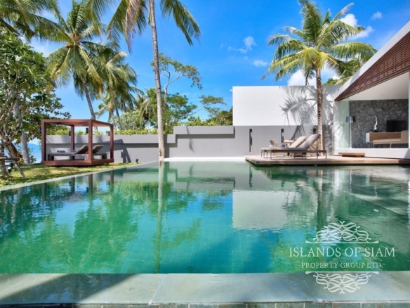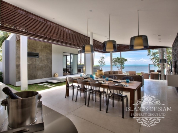 The absolute beachfront villa has a T-shaped infinity pool with loungers scattered about its deck. A lawned terrace separates the pool from the sandy beach and eventually spills out onto the golden sands, where an idyllic swing hangs from a tree, and a lovely deserted beach stretches out on both sides.