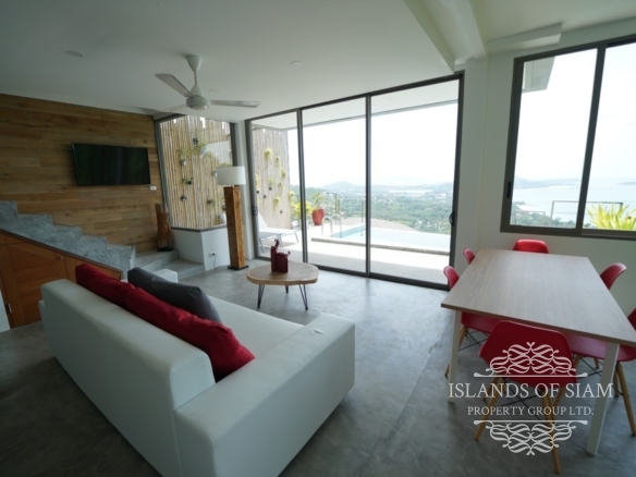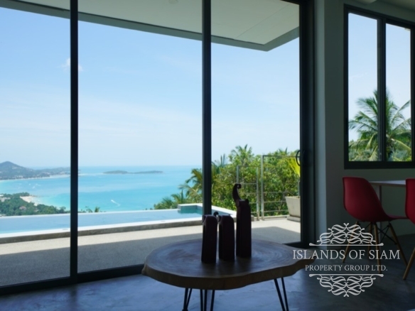 The open-plan living room-dining room-kitchen has floor-to-ceiling glass sliding doors filling the room with natural light and allowing day-long views of the ocean. Out on the pool deck there is a five metre long infinity pool with sun-loungers and the terrace is private with decorative bamboo walls on either side.