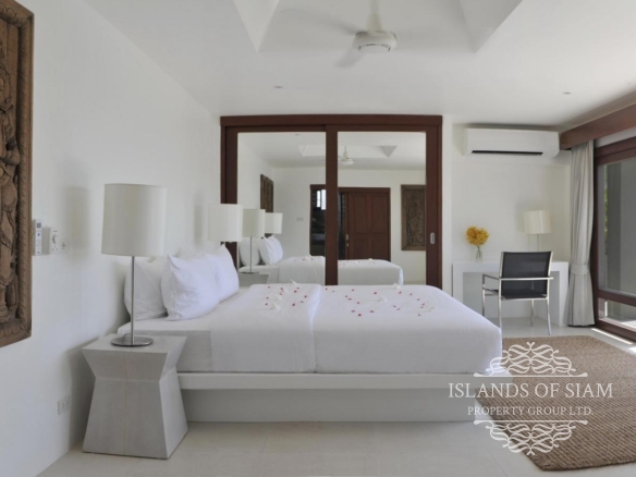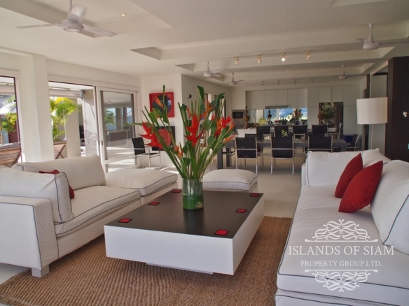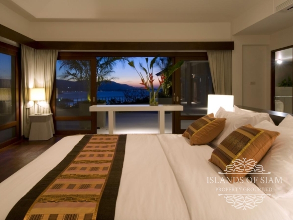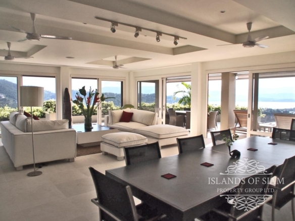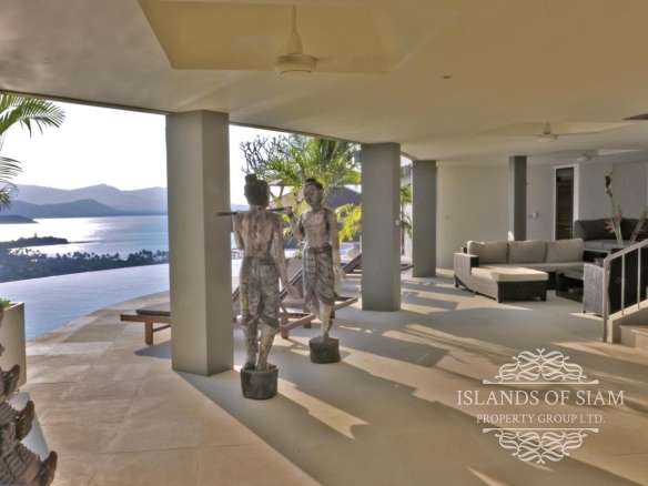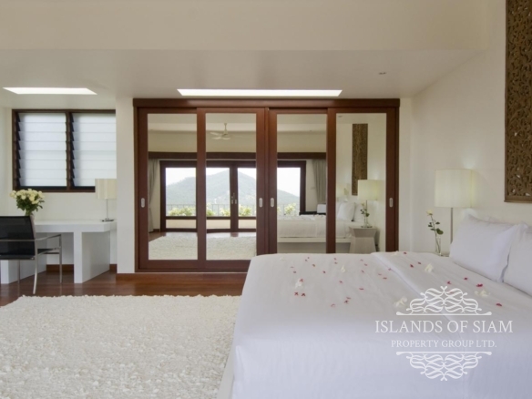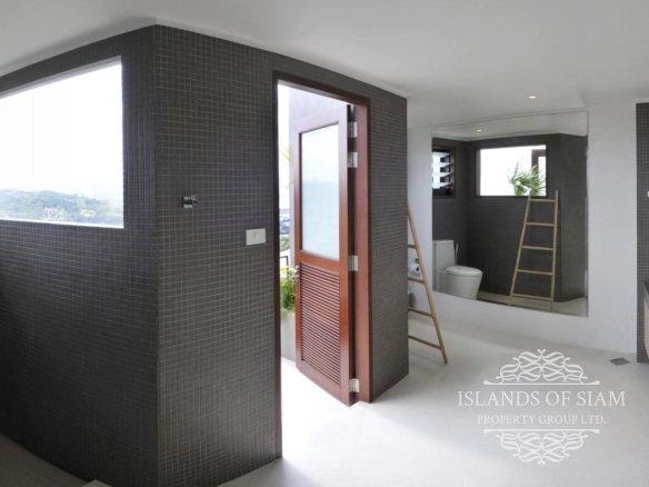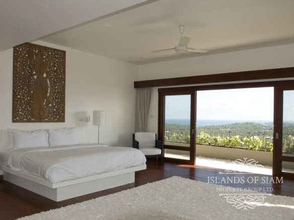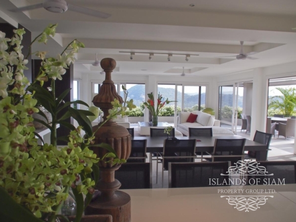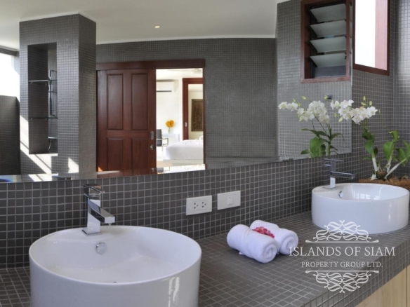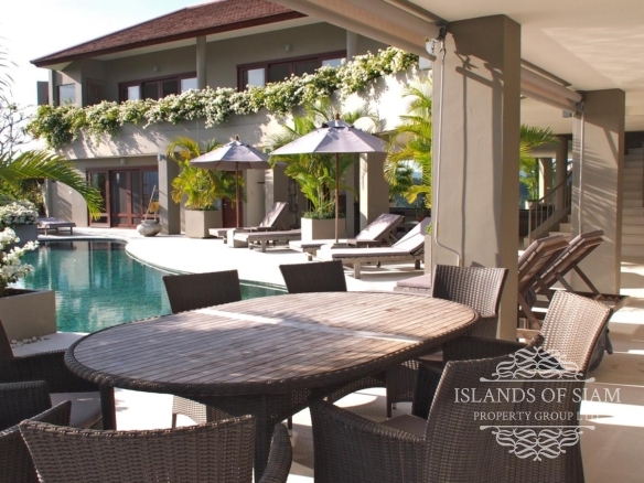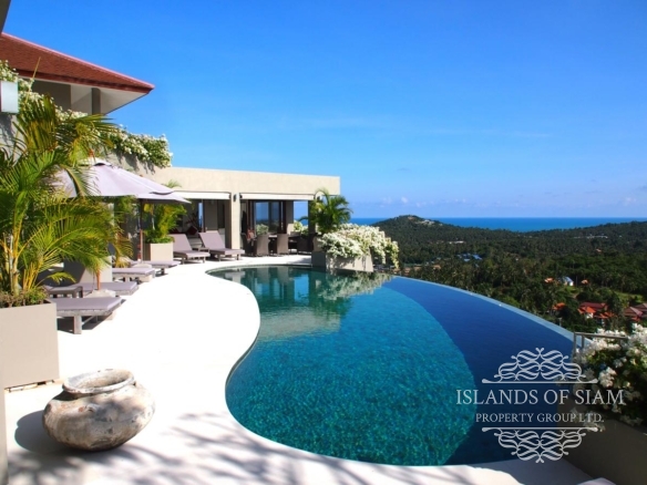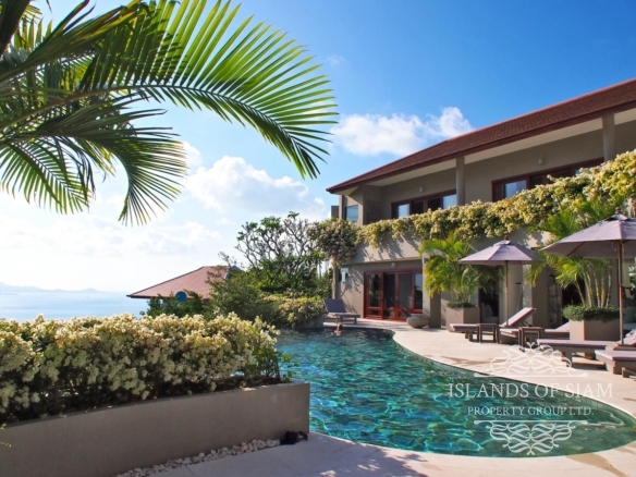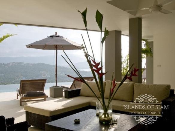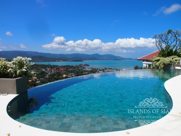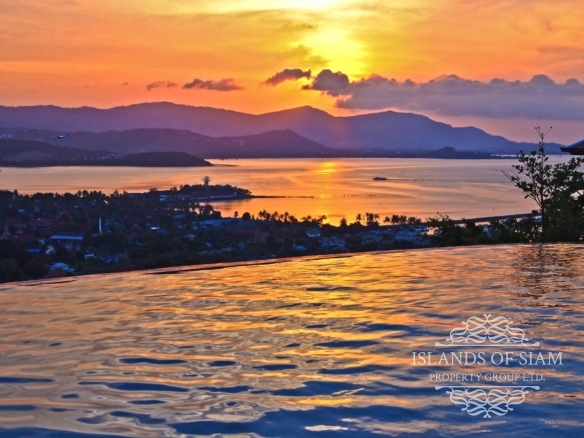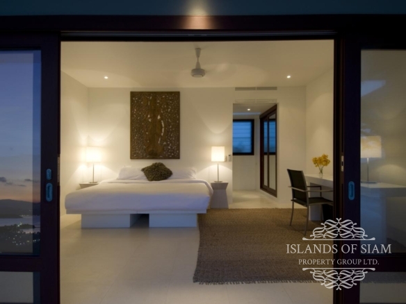 This stunning 5 bedroom hilltop villa has an 180 degree panorama vistas of both sunrise and sunset; you can take in the first light of dawn as the sun rises over Choeng Mon Bay, and then relax with a drink on the spacious terrace at sunset.