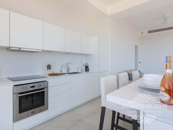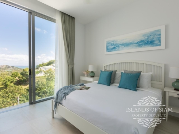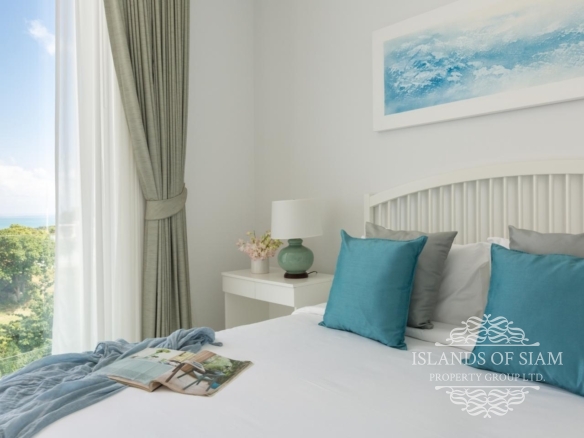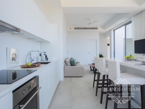Views don’t come any better than those from this attractive 88 sqm 2-bedroom apartment, one of two Penthouses at Residence 8, Samui’s most talked about new apartment development. In the main living area, the light and airy space has a fully equipped kitchen and a contemporary breakfast bar, as well as a relaxation area and a large flat-screen TV. Off the living room is a pleasant balcony for enjoying the morning sun whilst overlooking the large pool below and the vistas beyond.