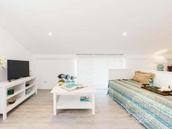 The integrated living and sleeping space have a queen size bed, sofa/ daybed and TV, cooking facilities and a fridge. There is a bathroom to the back. Outside, a large covered terrace with dining table.