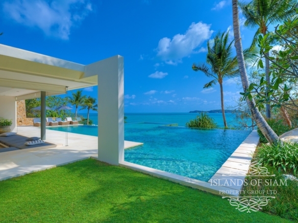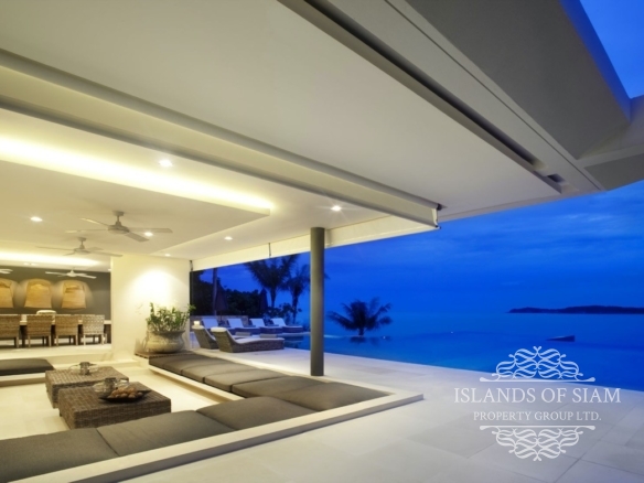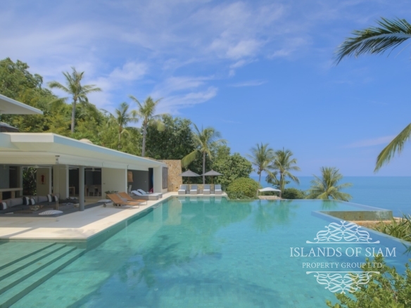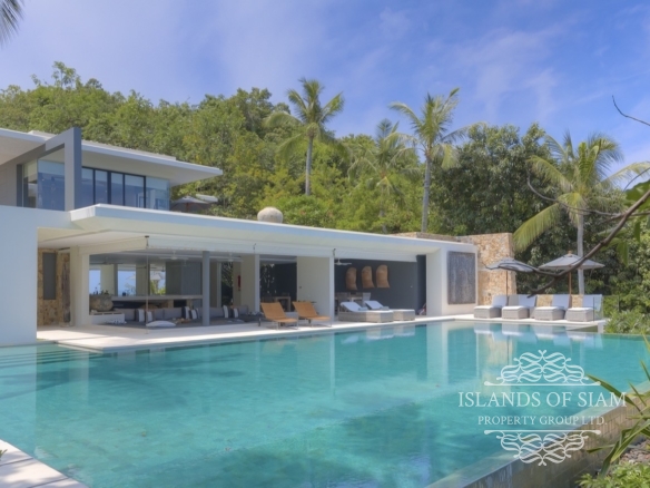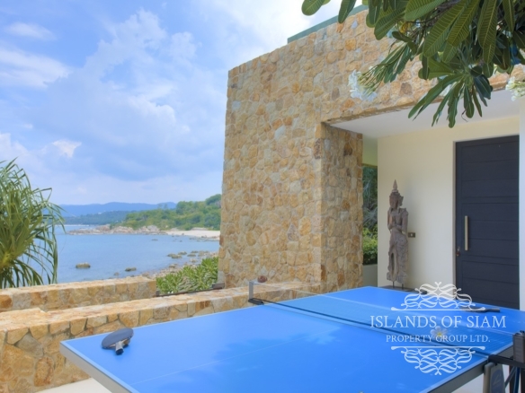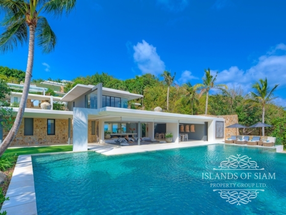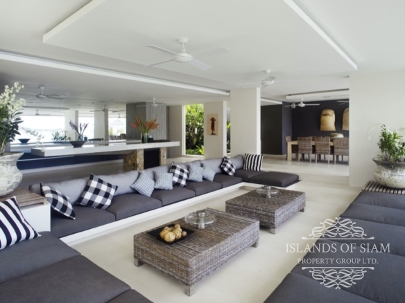 Villa 20 is a stunning oceanfront villa perched on the rocky shoreline and has been designed to highlight the uninterrupted ocean views. There are 5 large en-suite bedrooms, each with floor to ceiling windows and private terraces. An additional bedroom with bunk beds can comfortably sleep two children or teens. The open-plan guest kitchen and dining room overlook the huge sunken living room, framing one of the largest private infinity pools on Samui.