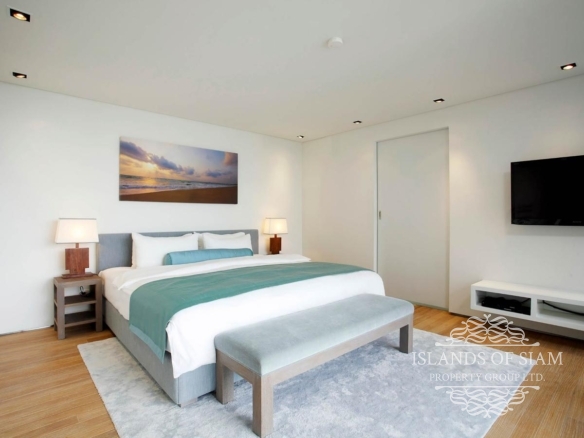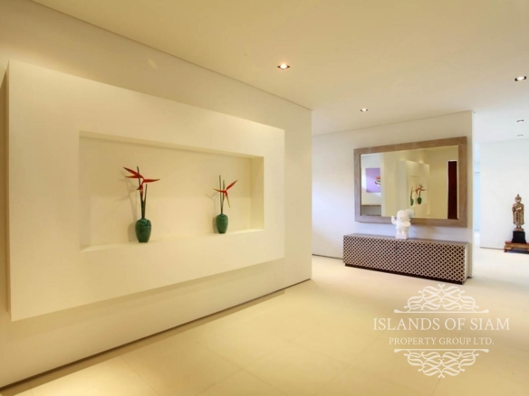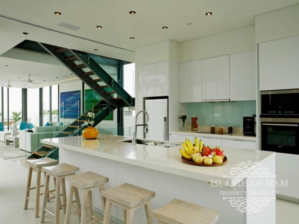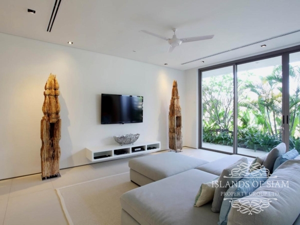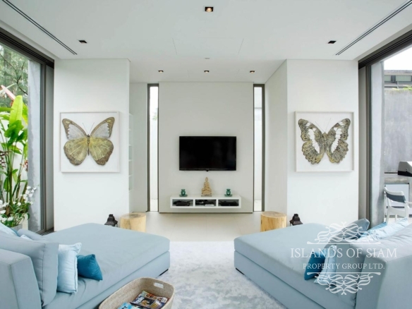 Villa Aqua’s open-plan L-shaped design creates a generous sense of space. Tucked away on the lower floor is a large games room with table tennis and a TV/audio system, a TV lounge equipped with a wall-mounted satellite channel TV and a DVD player, a cosy office and a spa room with saunas. A staircase of steel, wood and glass leads up to a bright modern kitchen with bar counter, a dining room with bench seating for eight, a snug media corner stocked with an impressive film and music library, and a large comfortable lounge. Both the lounge and dining areas open widely onto a pool terrace furnished with chic white sun loungers facing the 18-metre swimming pool. An outdoor lounge and barbecue area, poised for sunset cocktails and seafood feasts, complete the many options for relaxed tropical living at Villa Aqua.