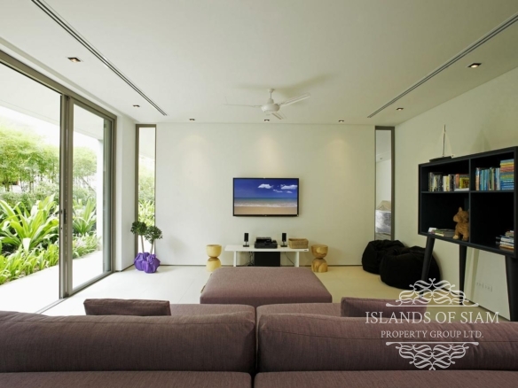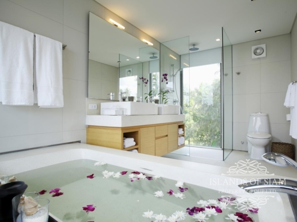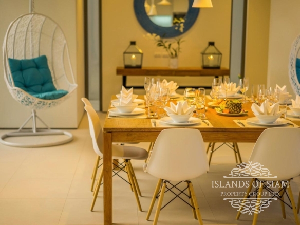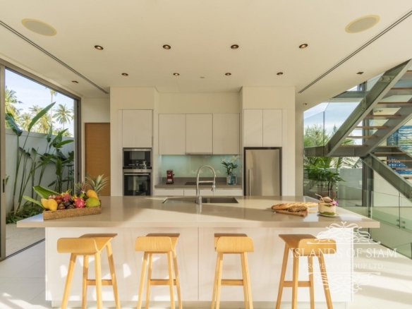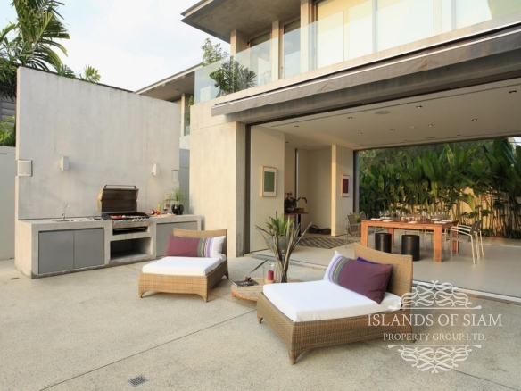 A sparkling 18-metre pool runs down one side of the villa, flanked by a lush garden bed and a pool terrace with sun loungers offering ample opportunity for low-key lazing. Though separated from the sands of Natai by a single row of villas, this sleek, tropical escape has stunning beach views and a leafy outlook, with spacious, living and dining areas opening to the pool, a TV room on the lower floor, a barbecue station and a shaded outdoor dining area with ocean vistas.