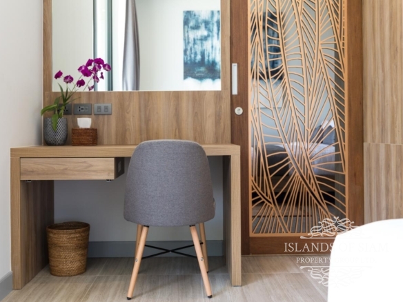 At the beachside end of the pool it forms an L shape with a further four sunken sun-loungers plus there’s also a sunken sala with cushions for relaxing beside the pool in the shade. From there, steps lead onto a lawn and the 25 metre beachfront and then down onto the beach where mangrove trees grow in the shallows. As you gaze out from here you have Koh Taen to the left and then to the right is the expanse of Thong Krut bay which has plenty of oceanfront restaurants and a fleet of Thai long-tail fishing boats.