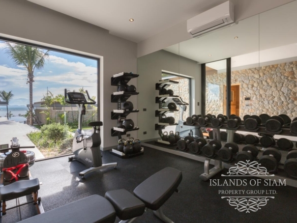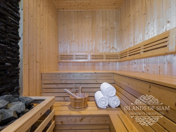 As you enter the property there are stairs to the right leading to three of the en-suite bedrooms (rooms 4, 3 and 5) but more about the sleeping accommodation a little later. Walking on you’ll see the gym on the right. It faces the ocean with floor-to-ceiling windows and is equipped with a rower, an upright bike, bench, a full set of kettle bells and dumbbells, medicine balls and a TRX suspension training system. And like all the rooms it’s fully air-conditioned. Opposite the gym is the sauna and down a few steps is the massage sala. We can arrange expert masseuses and therapists to come to the villa whenever it suits you. Opposite the sala there’s also a large trampoline in the kid’s garden and play area. And yes, the trampoline is designed to comfortably allow adults to join in the fun! The ‘Wellness Zone’ is ideal for both a serious workout and some contemplative pampering.