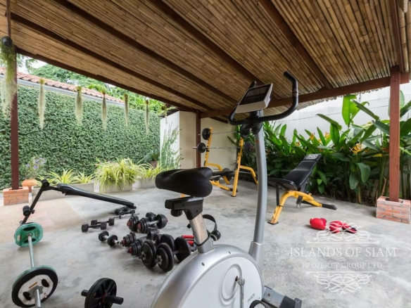 This Villa sleeps 10 – 12 guests and is a spacious 5 bedroom villa with fully equipped gym, games room, pool table and bar, it has a private 12 x 6m pool and Jacuzzi surrounded by a large sun bathing terrace and huge peaceful tropical gardens with a comfortable shaded Sala area surrounded by a Koi Carp pond.