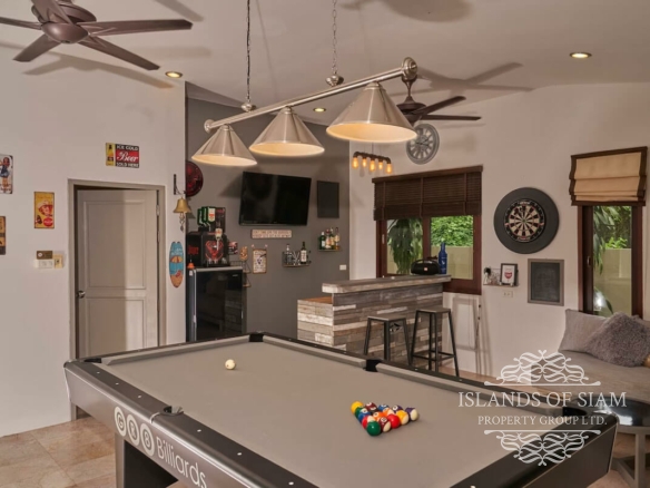 The main building has a huge open plan living space with comfortable sofa and flat screen TV. The dining area has an elegant dining table with seating for 12 guests over looked by a huge stone carving of Ganesha. The second building houses bedrooms 4 and 5 both of which have king size beds and are ensuite. This building also has the games room with Pool Table, 75” HDTV, darts board and it’s own bar.