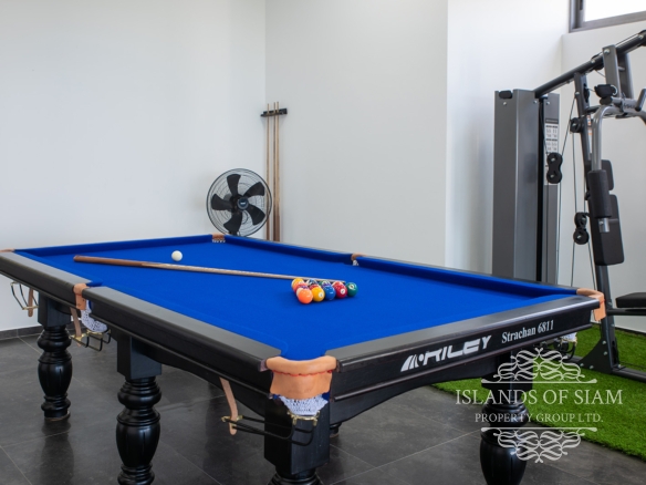 Whether basking in the allure of the infinity pool, staying active in the gym, engaging in friendly billiard matches, savoring moments of serenity in the basement relaxation area, or sipping a drink while enjoying the tropical surroundings, this villa promises an unforgettable retreat for those seeking an elegant and rejuvenating experience on the captivating island of Koh Samui