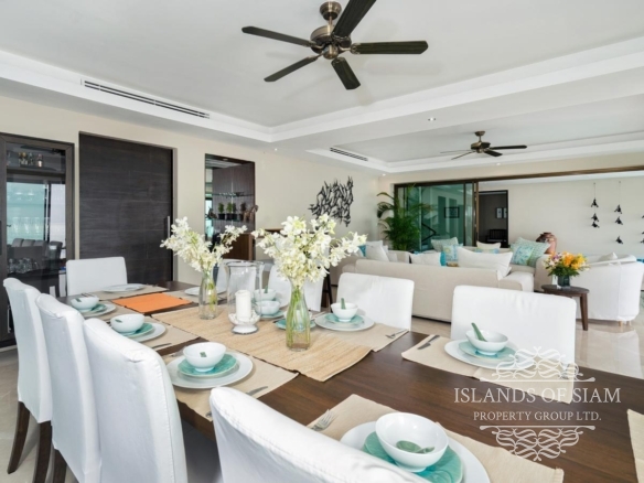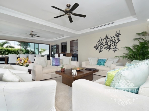 Access to the villa is via a delightful koi pond filled with lilies and exotic plants. Once inside, a spectacular view of the infinity pool and coastline unfolds. Here, you will find a bright and spacious, marble-floored living room that opens up onto the pool terrace. Social evenings can be spent here, relaxing on comfortable white sofas and easy chairs. And furnished with a bar and elegant dining table for 10, all your drinking and dining needs are taken care of with ease.