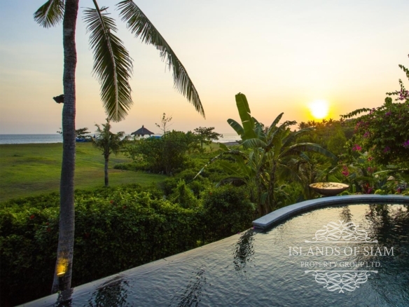 This blissful villa sits on the banks of a small lagoon, where the river meets the sea, with over 100 metres of beach frontage overlooking one of Canggu’s most famous surf breaks. Soft rolling lawns hug the landscape’s natural contours while a free-form 18-metre infinity swimming pool blends seamlessly with the ocean all the way to the horizon. The garden, bursting with fragrant frangipanis, swaying coconut palms and luscious green foliage, is a stunning private oasis, and amidst its tropical expanse lies the villa’s dedicated events space – a coconut grove directly connected to the beach via a pretty timber walkway, which makes an unforgettable setting for nuptial vows.