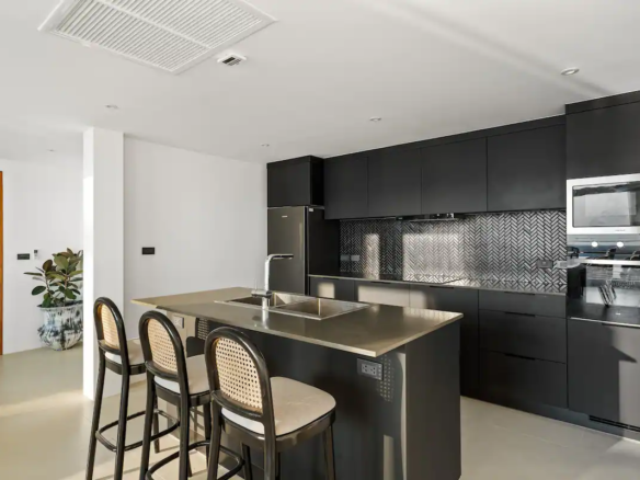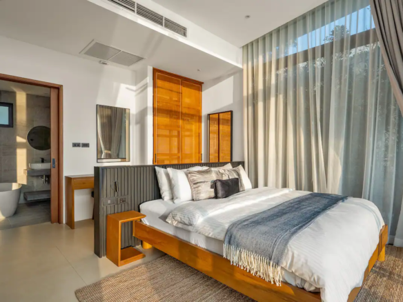 Experience the breathtaking beauty of a stunning sunset from the comfort of this luxurious 4-bedroom beachfront villa in Bang Makham. Each bedroom features an ensuite bathroom, ensuring privacy and convenience for all guests. With a team of three full-time staff available seven days a week, you can relax and enjoy your stay without any worries. The villa offers daily cleaning services, ensuring a pristine environment throughout your vacation. Take a dip in the saltwater private pool with a jacuzzi, perfect for unwinding and soaking up the tropical ambiance. Additionally, the fully equipped kitchen allows you to prepare meals with ease, making this villa the ideal choice for a memorable getaway.