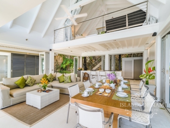 The second pavilion boasts a large open-plan living and dining area complete with a fully-equipped kitchen and foldaway glass doors that epitomise the tropical indoor/outdoor philosophy. Upstairs on the mezzanine level is the TV den, which can easily be converted into a third double bedroom thanks to two single beds, sofa bed, and blackout curtains, and comes with a fully equipped en-suite shower room.
