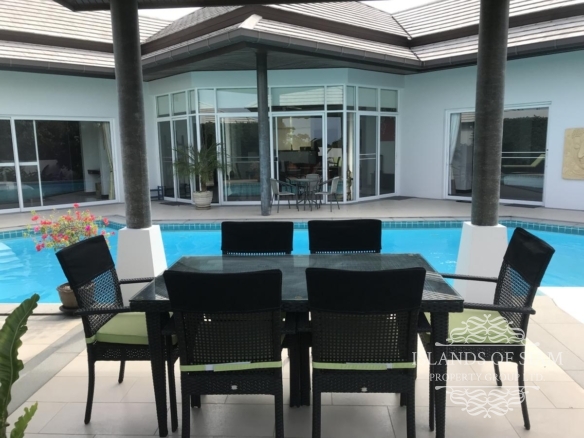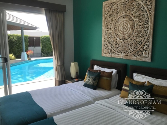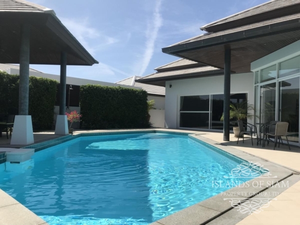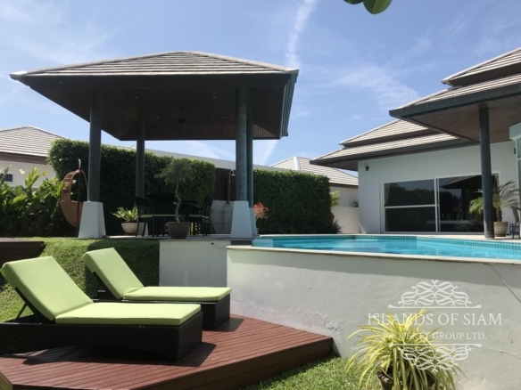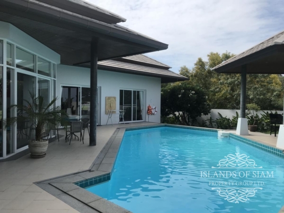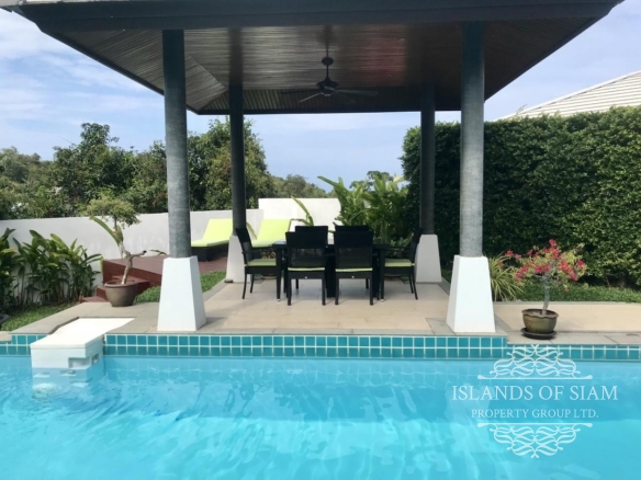 Villa Siam Noi is an extremely private villa, and only a 450m walk to one of the most beautiful beaches on the island. A large wooden entrance door leads you onto a spacious walled terrace that boasts a 60 sqm. pool set in a tropical garden. All three air-conditioned bedrooms lead on to the large pool terrace where you can take a midnight dip without disturbing your other guests. Two of the bedrooms adjoin the living room whereas the third bedroom is separate. All three bedrooms have en-suite bathrooms with the master bedroom having a bath as well as a shower. The large living and dining area provides plenty of space with the full kitchen located at the back behind the island bar. The kitchen has a large fridge/freezer, oven and microwave and all crockery and cutlery required for cooking. There is a small laundry room with a washing machine and ironing board.