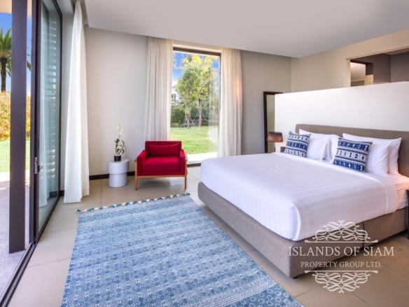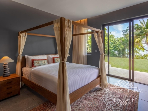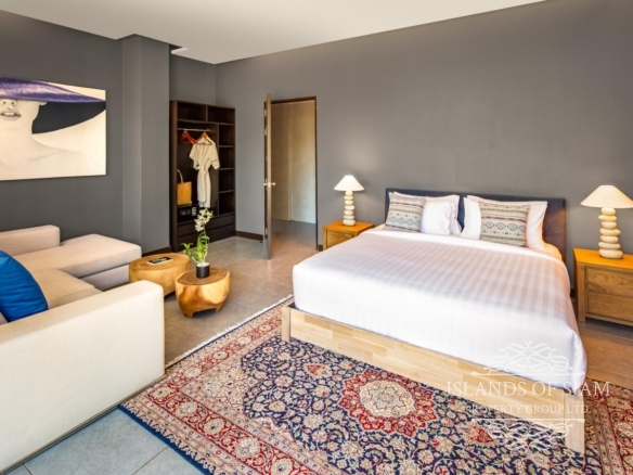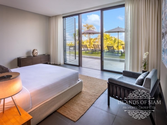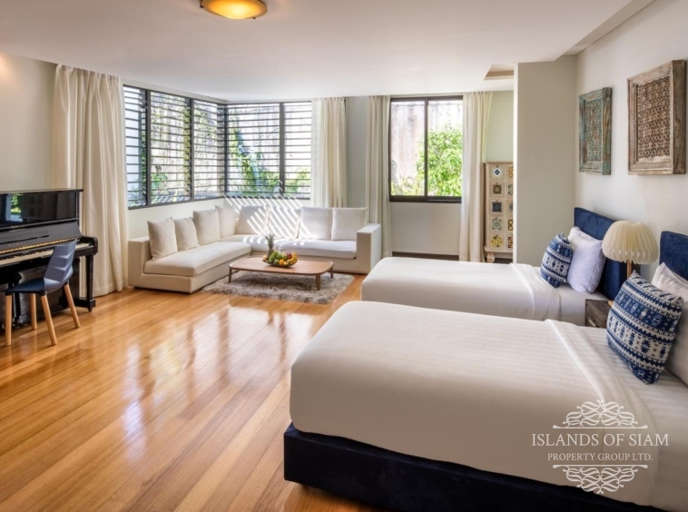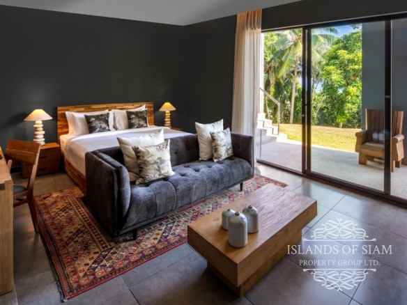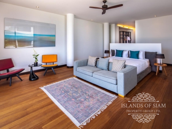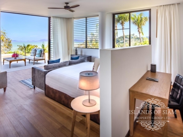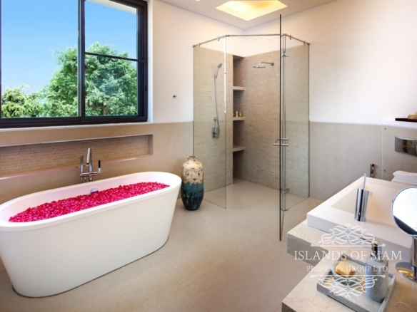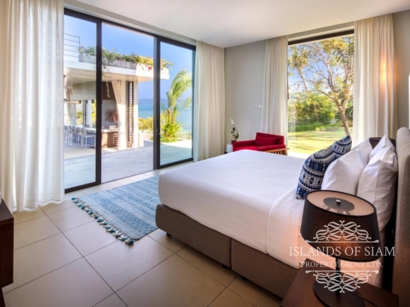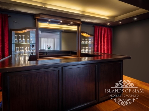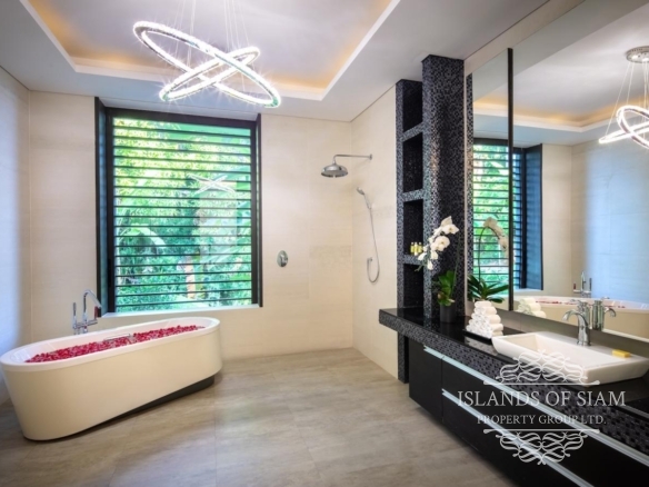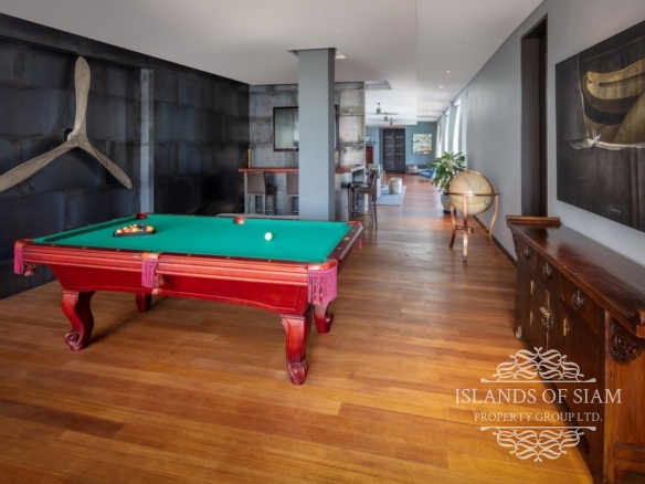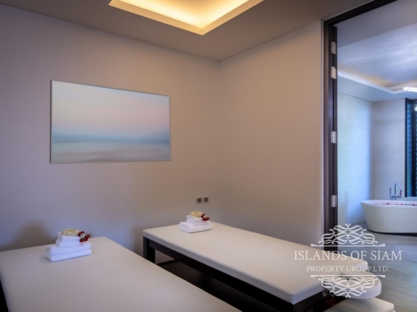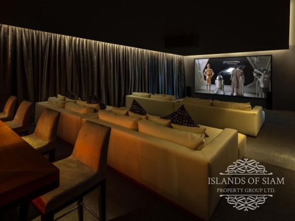 resplendent staircase tiled with elegant white, crystal blue, and lush green. Despite the humble entrance, the villa is truly capacious. In fact, it boasts the most number of bedrooms among any other property in the estate, totaling to ten – all of which are ensuite and features wonderful views of Phang Nga Bay. In addition, Villa Alchemy also houses impressive facilities to keep guests entertained including a handsomely designed home theater, a fully-equipped gym, a spa, and a billiards table.