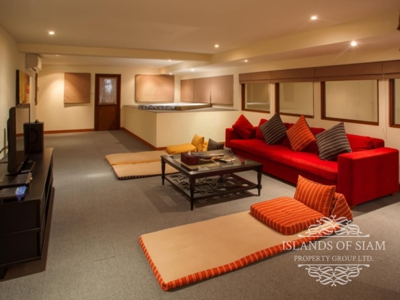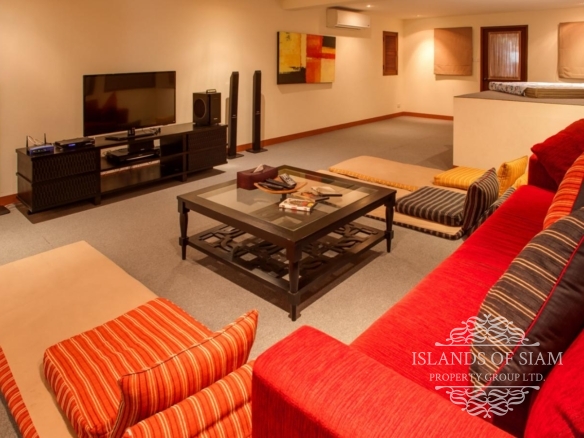 The main living, dining and kitchen area opens directly into the garden; the entire space drawing in the scenery and ocean breezes. This level also boasts a huge AV room that almost spans the length of the villa, complete with a home theatre system, large sofa and scatter cushions to relax on.