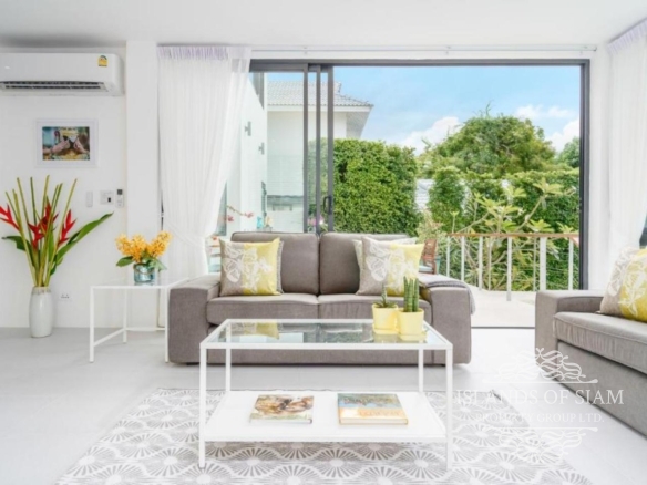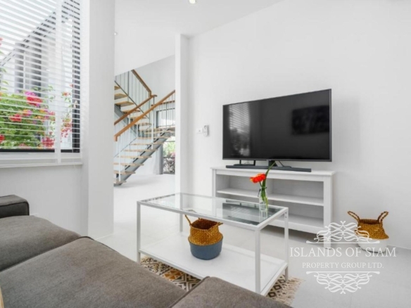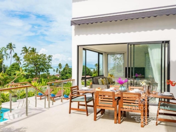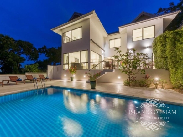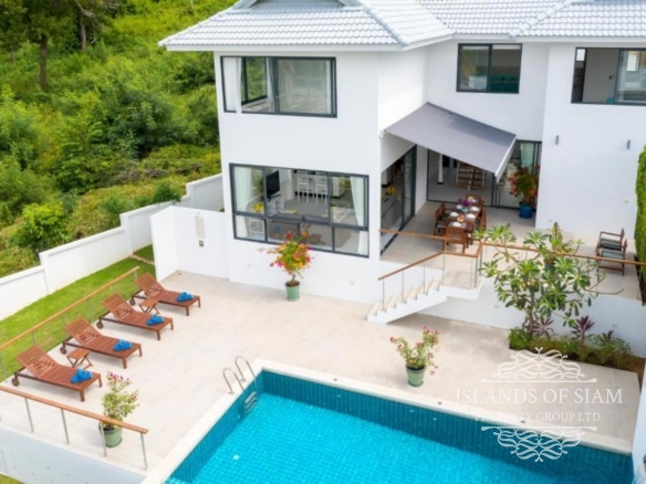 This bright and spacious four-bedroom house has wonderful views over the Gulf of Thailand to neighbouring Koh Phangan. Its large terrace and 8×4 metre swimming pool, edged by lawn area, are perfect for hanging out and enjoying the sun. An upper terrace has a dining table for eight people which can be covered by an electronically controlled sunshade. On entering the house, you will step into a soaring atrium, giving the feeling of light and airiness.