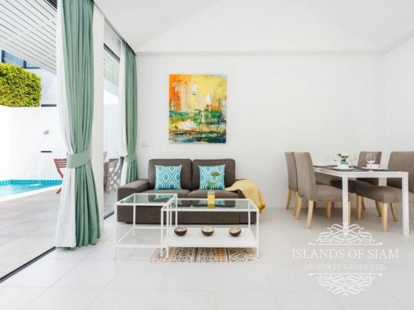 Cute and cosy, Villa Amethyst is designed to maximise space and light and is the perfect bijou property for one or two couples. Its loft style entrance leads to the open-plan kitchen and living room which has a flat screen TV, sofa and dining table for 4.