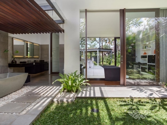 The two master building bedrooms have views over the treetops, while two more rooms are privately situated in a guest pavilion set within the garden. The villa’s chic lounge, dining and kitchen spaces feature floor-to-ceiling glass doors that open onto the 25-metre, timber-decked pool and immaculate garden, which bursts with a palette of green, white and yellow.